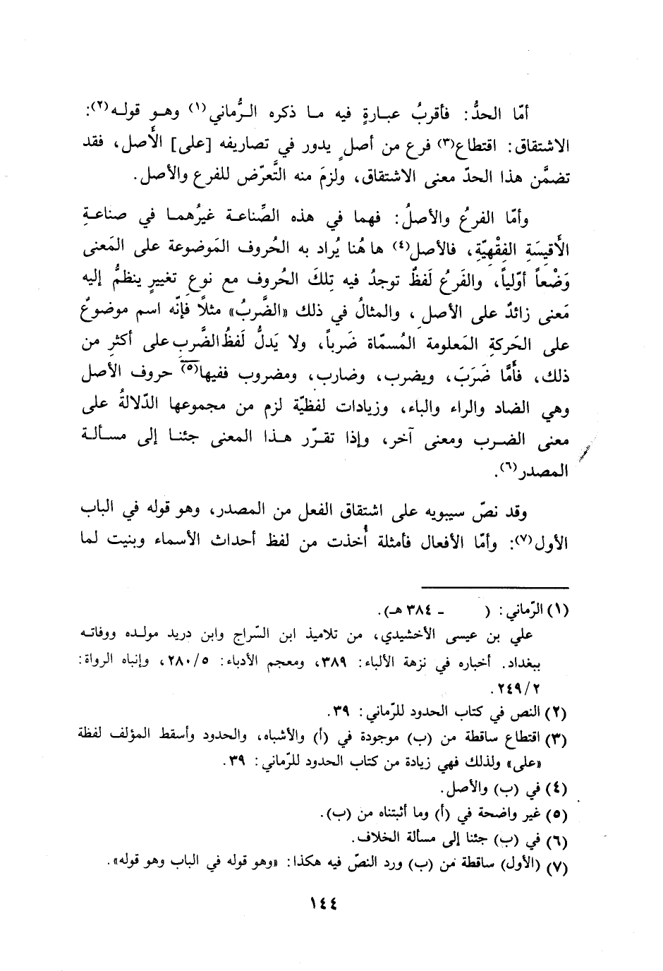 أمّا الحدُّ: فأقربُ عبارةٍ فيه ما ذكره الرُّماني وهو قوله: الاشتقاق: اقتطاع فرع من أصلٍ يدور في تصاريفه [على] الأَصل، فقد تضمَّن هذا الحدّ معنى الاشتقاق، ولزمَ منه التَّعرّض للفرع والأصل.