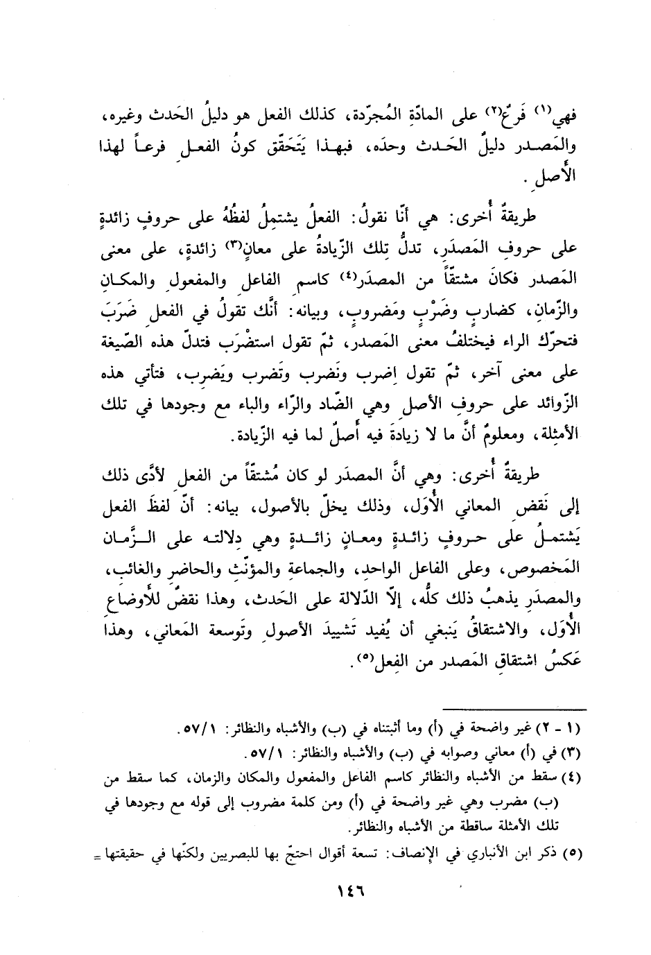 طريقةُ أُخرى: هي أنَّ المصدَر لو كان مُشتقّاً من الفعلِ لأدَّى ذلك إلى نَقضِ المعاني الأُوَل، وذلك يخلّ بالأصول، بيانه: أنّ لفظَ الفعل يَشتملُ على حروفٍ زائدةٍ ومعانٍ زائدةٍ وهي دِلالته على الزَّمان المَخصوص، وعلى الفاعل الواحدِ، والجماعةِ والمؤنّثِ والحاضرِ والغائبِ، والمصدَرِ يذهبُ ذلك كلُّه، إلاّ الدّلالة على الحَدث، وهذا نقضٌ للأَوضاعِ الأُوَل، والاشتقاقُ يَنبغي أن يُفيد تَشييدَ الأصولِ وتَوسعة المَعاني، وهذا عَكسُ اشتقاقِ المَصدر من الفِعل.