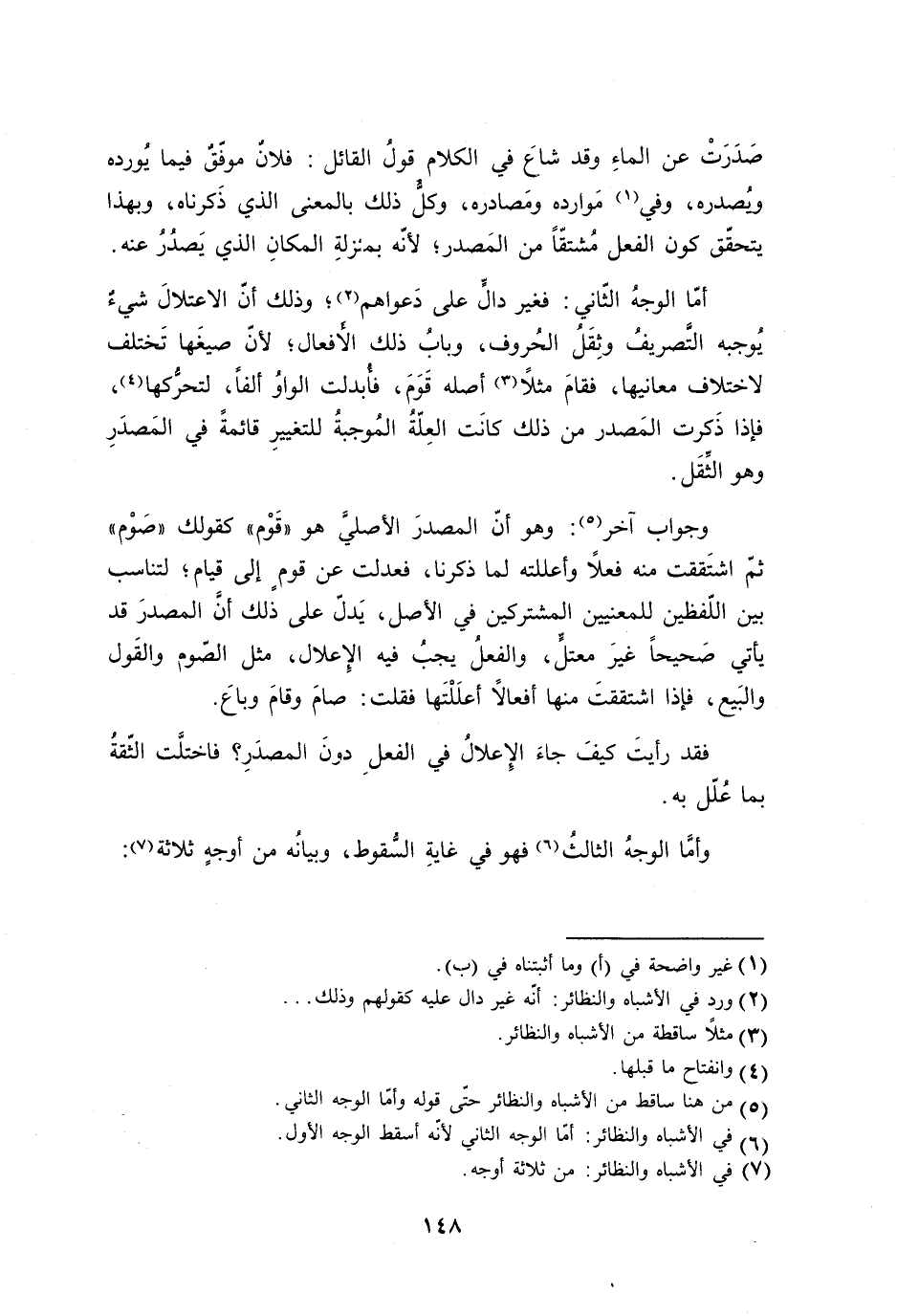 أمّا الوجهُ الثّاني: فغير دالٍّ على دَعواهم؛ وذلك أنّ الاعتلالَ شيءُ يُوجبه التَّصريفُ وثِقَلُ الحُروف، وبابُ ذلك الأَفعال؛ لأنّ صيغَها تَختلف لاختلاف معانيها، فقامَ مثلاً أصله قَوَمَ، فأُبدلت الواوُ ألفًا، لتحرُّكها، فإذا ذَكرت المَصدر من ذلك كانَت العِلّةُ المُوجبة للتغييرِ قائمةً في المَصدَرِ وهو الثِّقَل.