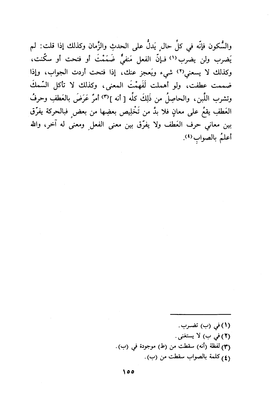 والسُّكون فإنّه في كلِّ حالٍ يَدلُّ على الحدثِ والزَّمان وكذلك إذا قلت: لم يَضرب ولن يضرب فإنّ الفعل مَنفيُّ ضَمَمْتَ أو فتحت أو سكّنت، وكذلك لا يسعني شيء ويَعجز عنك، إذا فتحت أردت الجواب، وإذا ضممت عطفت، ولو أهملت لَفَهمْتَ المعنى، وكذلك لا تأكل السّمكَ وتشرب اللَّبن، والحاصِلُ من ذَلِكَ كلِّه [أنه] أمرٌ عَرَضَ بالعَطفِ وحرفُ العَطفِ يقعُ على معانٍ فلا بدَّ من تَخْلِيص بعضِها من بعضٍ فبالحركة يفرّق بين معاني حرف العَطف ولا يفرّق بين معنى الفعلِ ومعنى له آخر، والله أعلمُ بالصوابِ.
