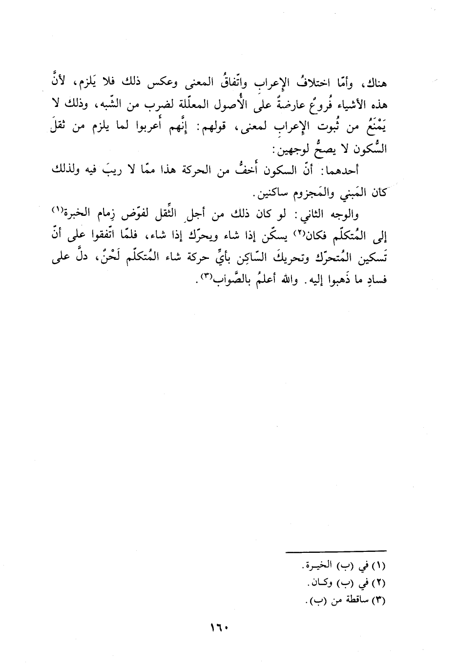 هناك، وأمّا اختلافُ الإِعرابِ واتّفاقُ المعنى وعكس ذلك فلا يَلزم، لأنَّ هذه الأشياء فُروعٌ عارضةٌ على الأُصول المعلّلة لضرب من الشّبه، وذلك لا يَمْنَعُ ثُبوت الإِعرابِ لمعنى، قولهم: إِنّهم أَعربوا لما يلزم من ثقلَ السُّكون لا يصحُّ لوجهين: