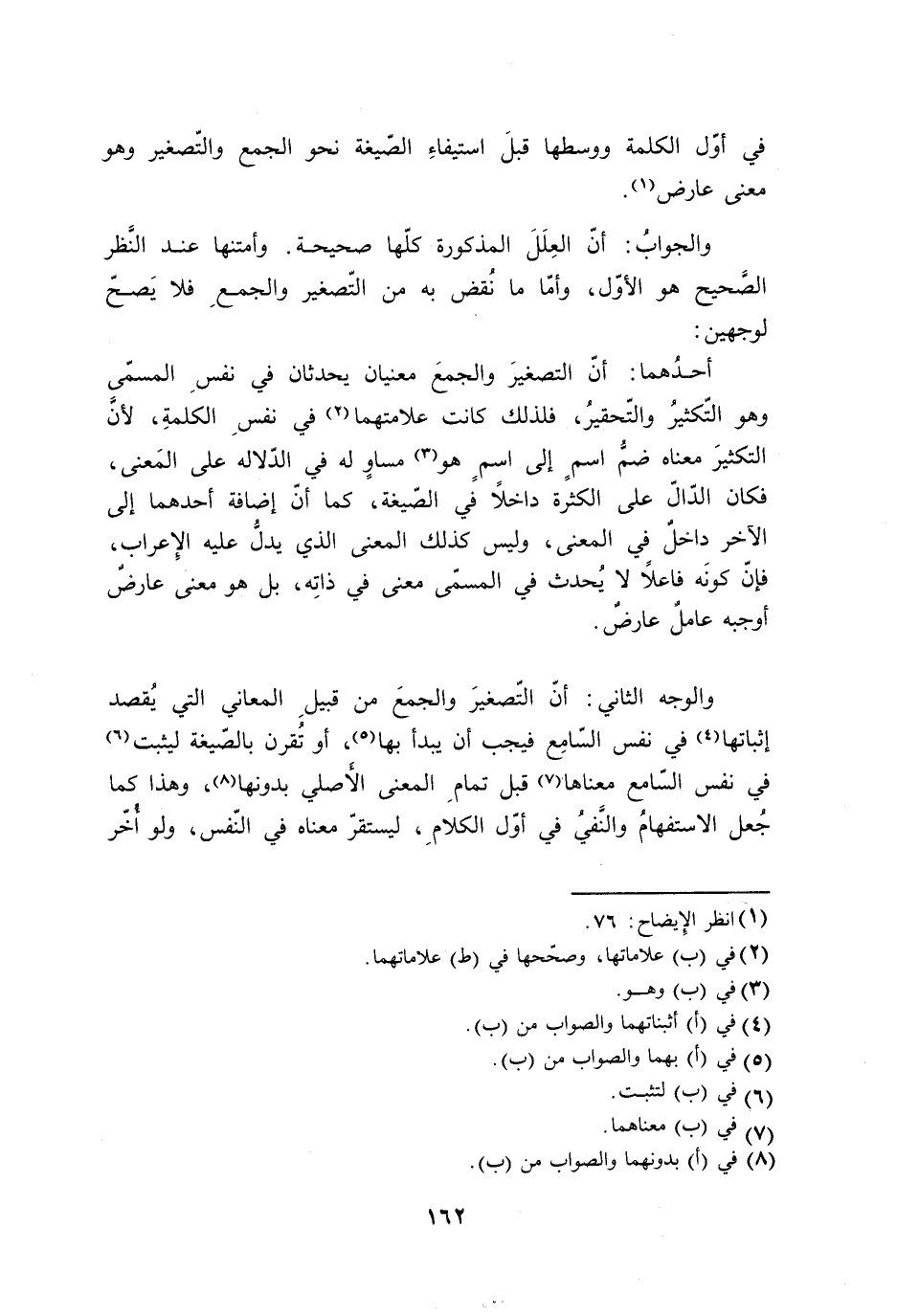 والوجه الثاني: أنّ التّصغيرَ والجمعَ من قبيلِ المعاني التي يُقصد إثباتها في نفس السّامِع فيجب أن يبدأ بها، أو تُقرن بالصّيغة ليثبت في نفس السّامع معناها قبل تمامِ المعنى الأَصلي بدونها، وهذا كما جُعل الاستفهامُ والنَّفيُ في أوّل الكلامِ، ليستقرّ معناه في النّفس، ولو أُخّر