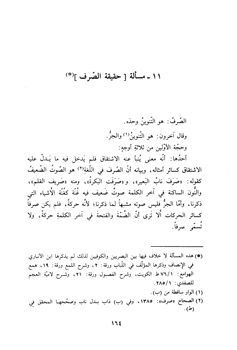 أحدُها: أنّه معنى يُنبأ عنه الاشتقاق فلم يَدخل فيه ما يَدلّ عليه الاشتقاق كسائر أمثاله، وبيانه أنّ الصّرفَ في اللّغةِ هو الصّوتُ الضّعيفُ كقوله: ((صَرَفَ نابُ البَعير))، و ((صَرَفت البَكرةُ))،ومن ((صَريف القلم))، والنُّون الساكنة في آخر الكلمة صوتُ ضَعيف فيه غُنّة كغُنّة الأَشياء التي ذكرنا، وأمّا الجرُّ فليس صوته مشبهًا لما ذكرنا؛ لأنّه حركةٌ، فلم يكن صرفًا كسائر الحركات أَلا تَرى أنّ الضَّمّةَ والفتحةَ في آخر الكلمةِ حركةُ، ولا تُسمّى صرفًا.