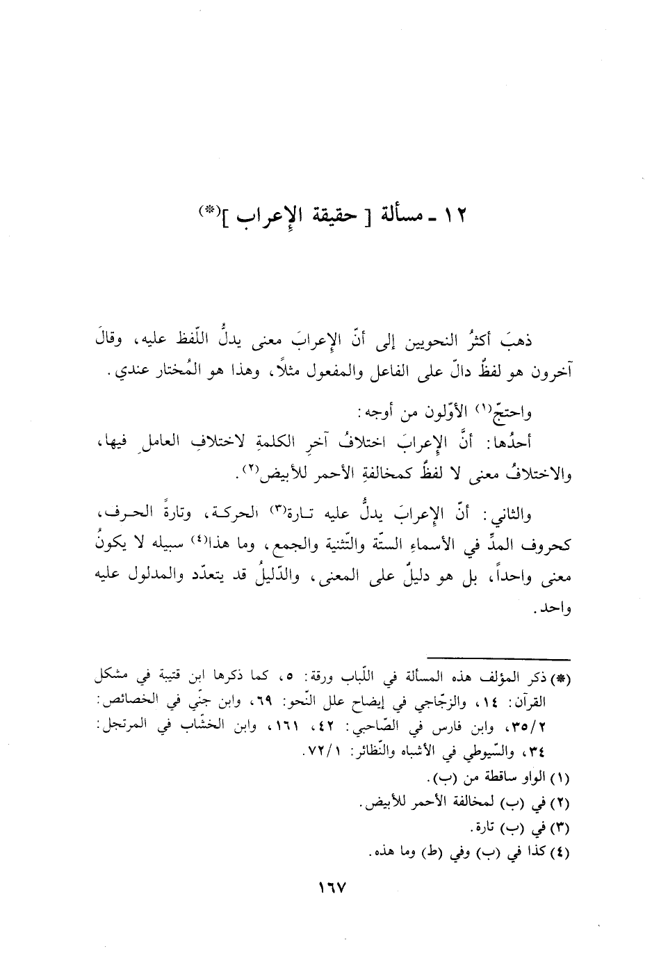 ذهبَ أكثرُ النحويين إلى أنّ الإِعرابَ معنى يدلُّ اللّفظ عليه، وقالَ آخرون هو لفظُ دالٌ على الفاعل والمفعول مثلاً، وهذا هو المُختار عندي.