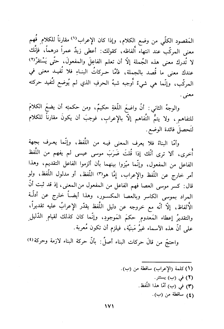 المَقصود الكلّي من وضع الكلام، وإذا كان الإِعراب مقارنًا للكلامِ فُهم معنى المركّب عند انتهاء أَلفاظه، كقولك: أعطى زيدٌ عمراً درهماً، فإنَّك لا تُدرك معنى هذه الجُملة إلاّ أن تعلم الفاعِلَ والمفعولَ، حتّى يَسْتقرّ عندك معنى ما قُصد بالجملة، فأمَّا حركاتُ البناءِ فلا تُفيد معنى في المرّكب، وإنّما هي شيءُ أَوجبه شبهُ الحرفِ الذي لم يُوضع لتُفيد حركته معنى.