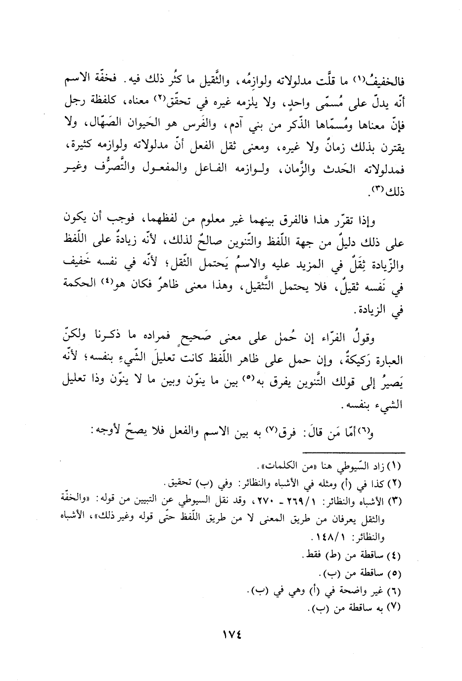 فالخفيفُ ما قلَّت مدلولاته ولوازِمُه، والثَّقل ما كثُر ذلك فيه. فخفّة الاسم أنّه يدلّ على مُسمّى واحدٍ، ولا يلزمه غيره في تحقّق معناه، كلفظة رجل فإنّ معناها ومُسمّاها الذّكر من بني آدم، والفَرس هو الحَيوان الصَهّال، ولا يقترن بذلك زمانٌ ولا غيره، ومعنى ثقل الفعل أنّ مدلولاته ولوازمه كثيرة، فمدلولاته الحَدث والزَّمان، ولوازمه الفاعل والمفعول والتَّصرُّف وغير ذلك.