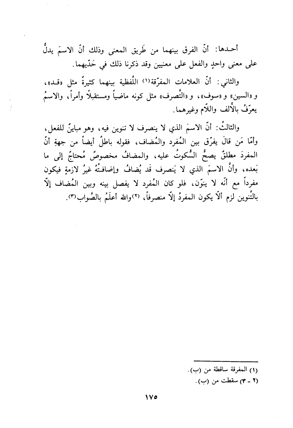 والثالثُ: أنّ الاسمَ الذي لا ينصرف لا تنوين فيه، وهو مباينٌ للفعل، وأمّا مَن قالَ يفرّق بين المُفرد والمُضاف، فقوله باطلٌ أيضًا من جهةِ أنّ المفردَ مطلقٌ يصحُّ السُّكوتُ عليه، والمضافُ مخصوصٌ مُحتاجٌ إلى ما بَعده، وأنَّ الاسمَ الذي يَنصرف قَد يُضافُ وإضافتُهُ غيرُ لازمةٍ فيكون مفردًا مع أنّه لا ينوّن، فلو كان المُفرد لا يفصل بينه وبين المُضاف إلاّ بالتَّنوين لزم ألاّ يكون المفردُ إلاّ منصرفًا، والله أعلَمُ بالصَّواب.