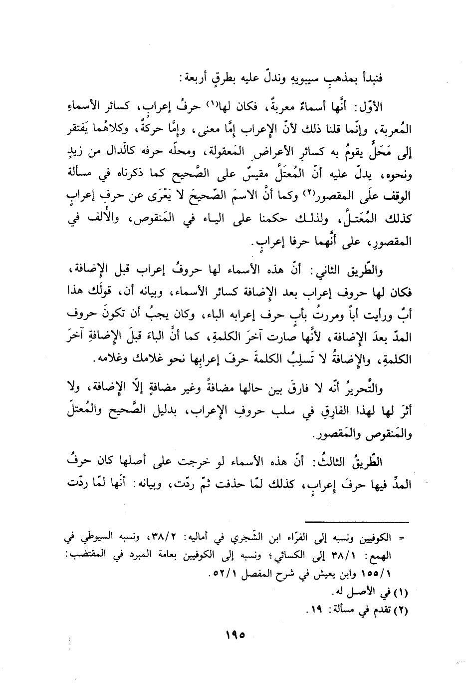 والطّريق الثاني: أنّ هذه الأسماء لها حروفُ إعراب قبل الإِضافة، فكان لها حروف إعراب بعد الإِضافة كسائر الأسماء، وبيانه أن، قولَك هذا أبٌ ورأيت أباً ومررتُ بأبٍ حرف إعرابه الباء، وكان يجبُ أن تكونَ حروف المدّ بعدَ الإِضافة، لأنَّها صارت آخرَ الكلمةِ، كما أنَّ الباءَ قبلَ الإضافةِ آخرَ الكلمةِ، والإضافةُ لا تَسلِبُ الكلمةَ حرفَ إعرابِها نحو غلامك وغلامه.