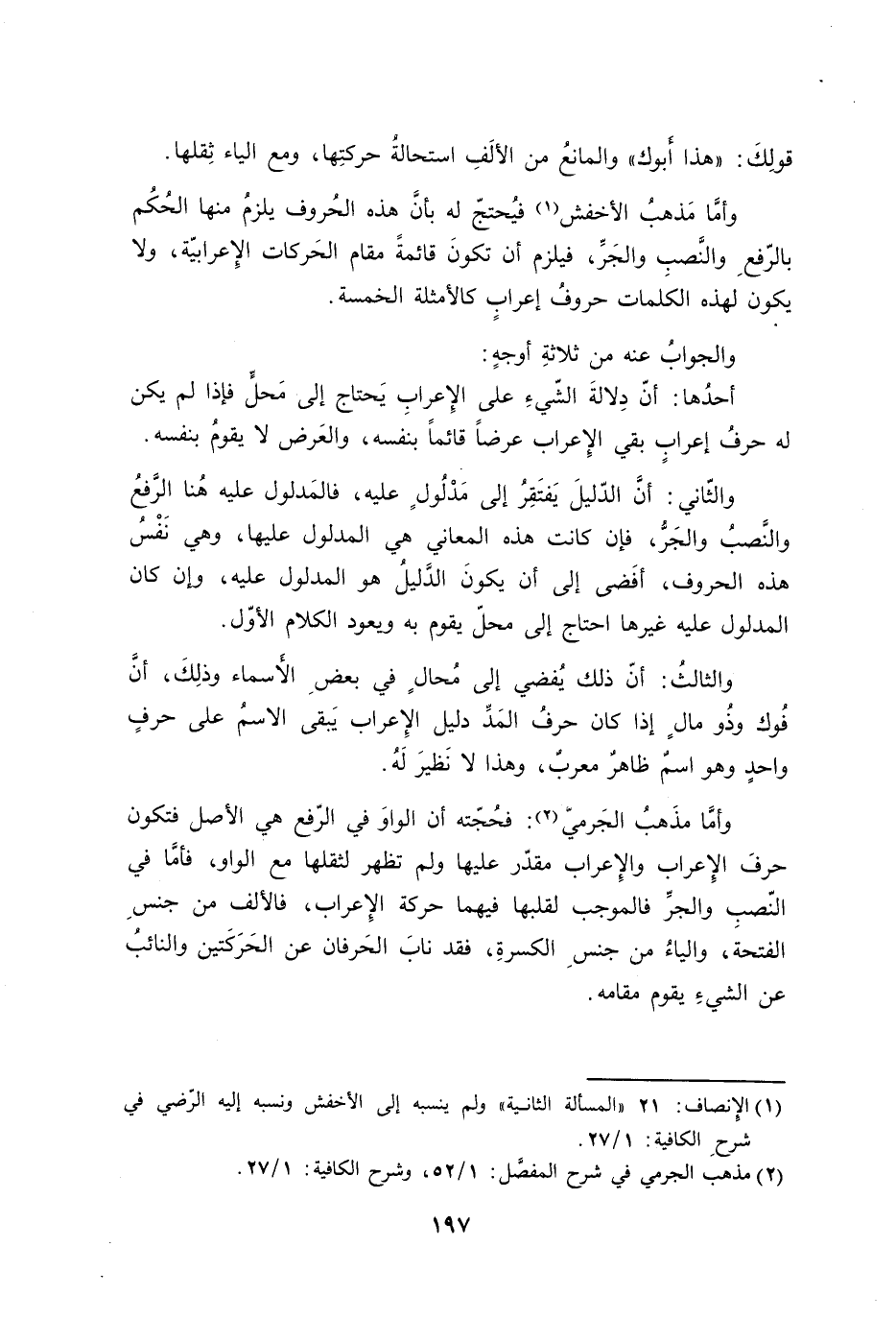 وأمَّا مَذهبُ الأخفش فيُحتجّ له بأنَّ هذه الحُروف يلزمُ منها الحُكُم بالرّفعِ والنَّصبِ والجَرِّ، فيلزم أن تكونَ قائمةً مقام الحَركات الإِعرابيّة، ولا يكون لهذه الكلمات حروفُ إعرابٍ كالأمثلة الخمسة.