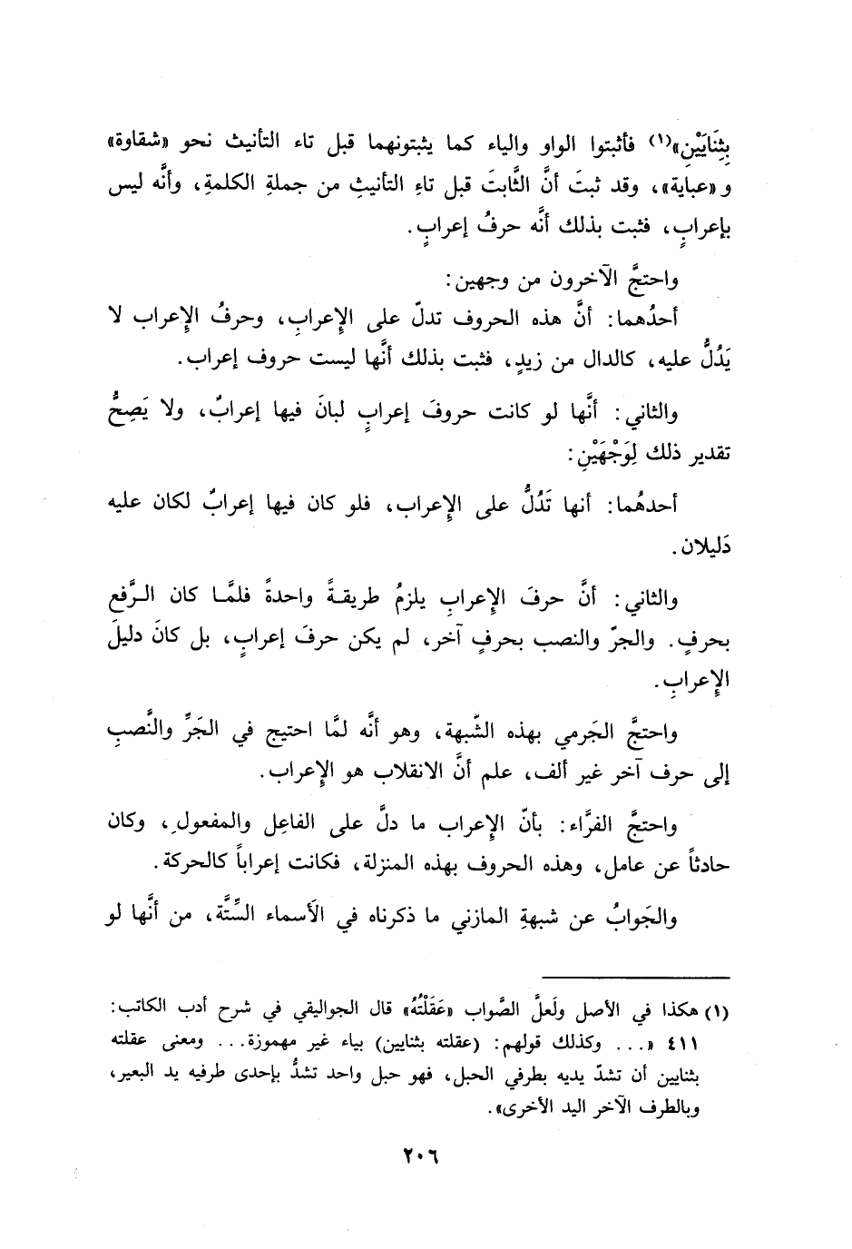 بِثِنَايَيْنِ)) فأثبتوا الواو والياء كما يثبتونهما قبل تاء التأنيث نحو ((شقاوة)) و ((عباية))، وقد ثبتَ أنَّ الثّابتَ قبل تاءِ التأنيثِ من جملةِ، وأنَّه ليس بإعرابٍ، فثبت بذلك أنَّه حرفُ إعرابٍ.