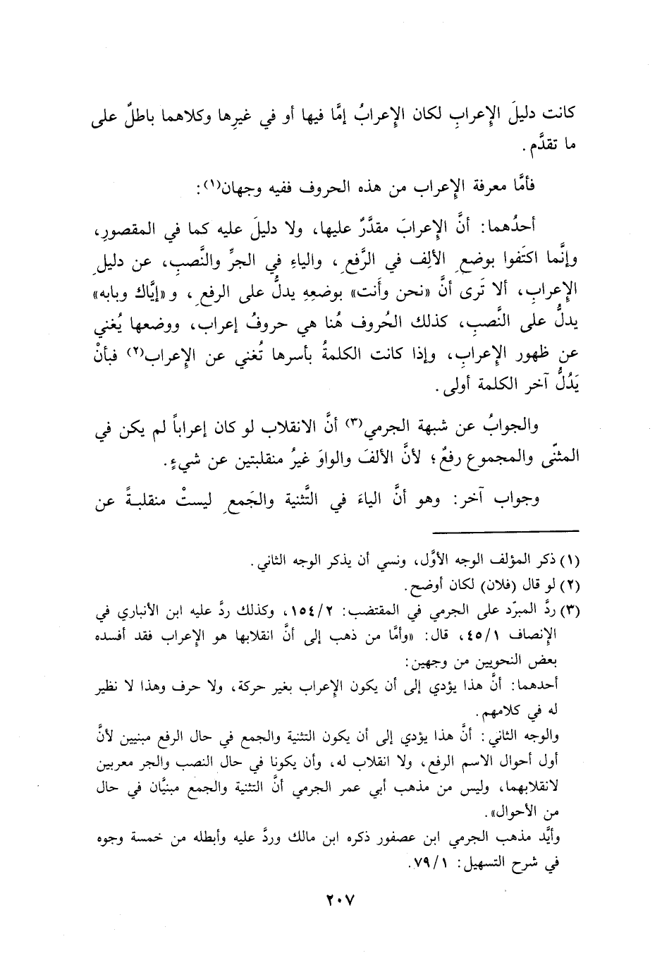 أحدُهما: أنَّ الإِعرابَ مقدَّرٌ عليها، ولا دليلَ عليه كما في المقصورِ، وإنَّما اكتَفوا بوضعِ الألِف في الرَّفعِ، والياءِ في الجرِّ والنَّصبِ، عن دليلِ الإِعرابِ، ألا تَرى أنَّ ((نحن وأَنت)) بوضعِهِ يدلُّ على الرفعِ، و ((إيَّاك وبابه)) يدلُّ على النَّصبِ، كذلك الحُروف هُنا هي حروفُ إعراب، ووضعها يُغني عن ظهور الإِعرابِ، وإذا كانت الكلمةُ بأسرها تُغني عن الإِعراب فبأنْ يَدُلُّ آخر الكلمة أولى.