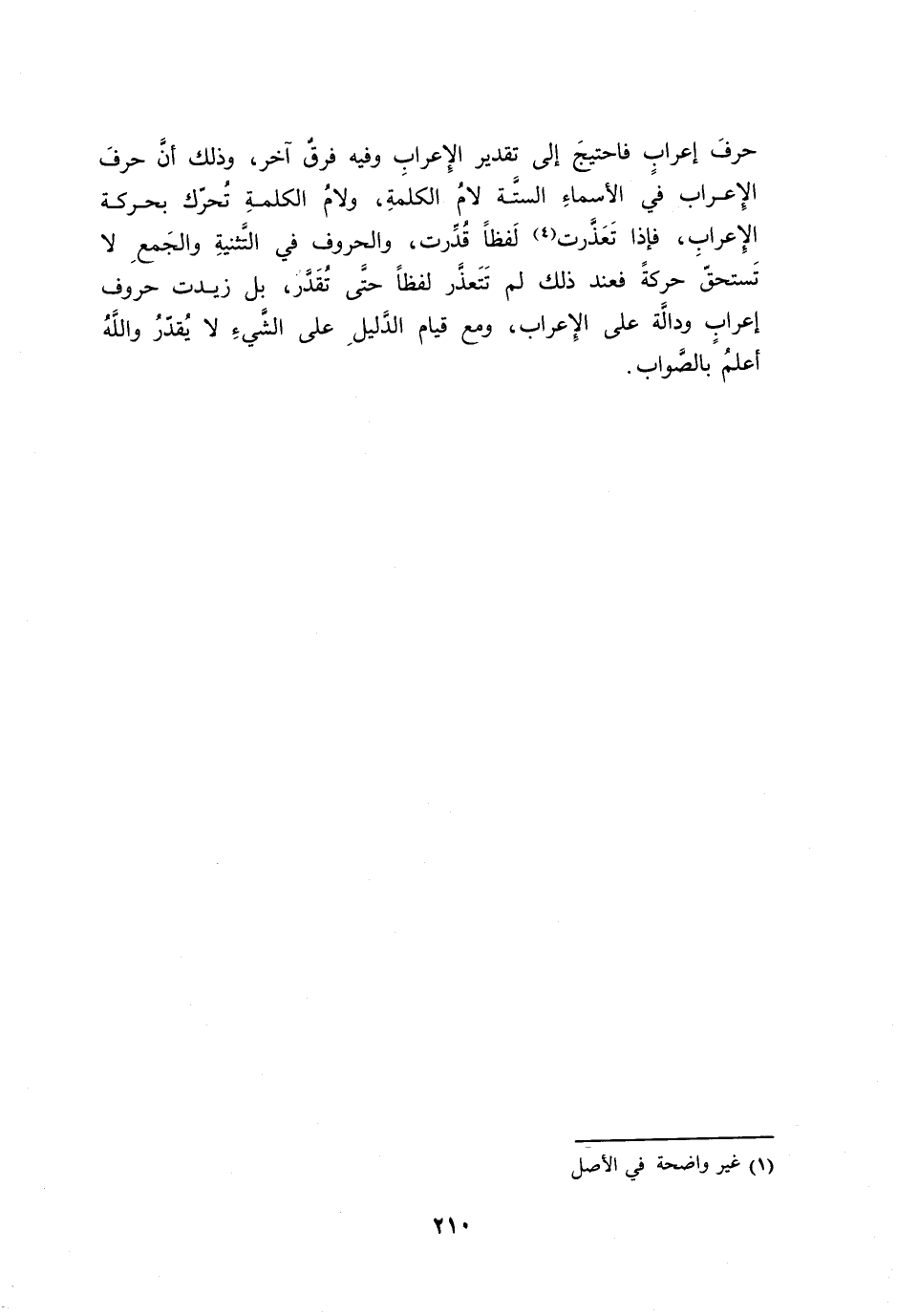حرفَ إعرابٍ فاحتيجَ إلى تقدير الإِعرابِ وفيه فرقٌ آخر، وذلك أنَّ حرفَ الإِعراب في الأسماءِ الستَّة لامُ الكلمةِ، ولامُ الكلمةِ تُحرّك بحركة الإِعرابِ، فإذا تَعَذَّرت لَفظاً قُدِّرت، والحروف في التَّثنيةِ والجَمعِ لا تَستحقّ حركةً فعند ذلك لم تَتَعذَّر لفظاً حتَّى تُقَدَّر، بل زيدت حروف إعرابٍ ودالَّة على الإِعراب، ومع قيام الدَّليلِ على الشَّيءِ لا يُقدّرُ واللَّهُ أعلمُ بالصَّواب.