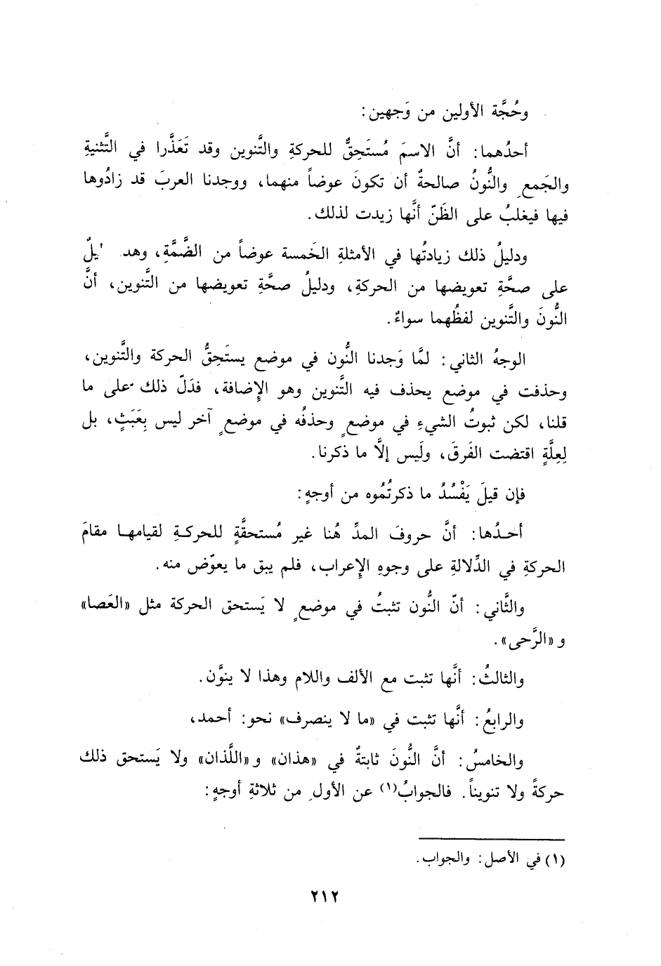 والخامسُ: أنَّ النُّونَ ثابتةٌ في ((هذان)) و ((اللَّذان)) ولا يَستحق ذلك حركةً ولا تنويناً. فالجوابُ عن الأولِ من ثلاثةِ أوجهٍ: