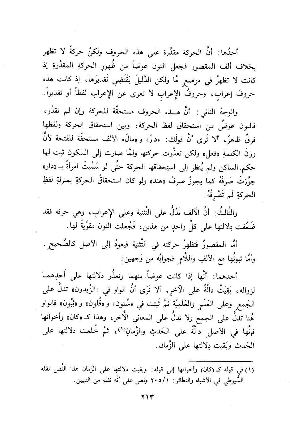 أحدهما: أنَّها إذا كانت عوضاً منهما وتعذَّر دلالتها على أَحدِهما لزواله، بَقِيَتْ دالَّةً على الآخرِ، ألا تَرَى أنَّ الواو في ((الزَّيدون)) تدلُّ على الجَمع وعلى العَلَمِ والعَلَمِيَّة ثمَّ ثَبتت في ((سُنون)) و ((قُلون)) و ((ثُبون)) فالواو هُنا تدلُّ على الجمع ولا تدلُّ على المعاني الأُخر، وهذا ك ((كان)) وأخواتها فإنَّها في الأصلِ دالَّةٌ على الحَدثِ والزَّمانِ، ثمَّ خُلعت دلالتها على الحَدث وبَقيت دِلالتها على الزَّمان.