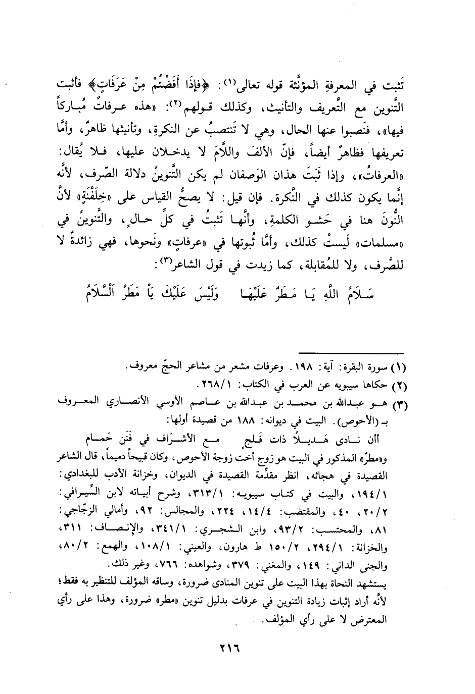 تَثبت في المعرفةِ المؤنَّثة قوله تعالى: {فإذَا أَفَضْتُمْ مِنْ عَرَفَاتٍ} فأثبت التَّنوين مع التَّعريف والتأنيث، وكذلك قولهم: ((هذه عرفاتٌ مُباركاً فيها))، فنَصبوا عنها الحال، وهي لا تَنتصبُ عن النكرةِ، وتأنيثها ظاهرٌ، وأمَّا تعريفها فظاهرٌ أيضاً، فإنّ الألفَ واللاَّمَ لا يدخلان عليها، فلا يُقال: ((العرفاتُ))، وإذا ثَبَتَ هذان الوَصفان لم يكن التَّنوينُ دلالة الصّرف، لأنَّه إنَّما يكون كذلك في النَّكرة. فإن قيل: لا يصحُّ القياس على ((خِلَفْنَةٍ)) لأنَّ النُّون هنا في حَشو الكلمةِ، وأنَّها تَثبتُ في كلِّ حالٍ، والتَّنوينُ في ((مسلمات)) لَيستْ كذلك، وأمَّا ثُبوتها في ((عرفاتٍ)) ونَحوها، فهي زائدةٌ لا للصَّرف، ولا للمُقابلة، كما زيدت في قول الشاعر: