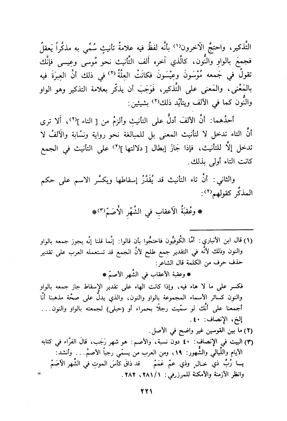 التَّذكير، واحتجَّ الآخرون بأنّه لفظٌ فيه علامةُ تأنيثٍ سُمِّي به مذكَّراً يَعقلُ فجمعَ بالواوِ والنُّون، كالَّذي آخره أَلف التَّأنيث نحو مُوسى وعِيسى فإنَّك تقولُ في جَمعه مُوْسَونَ وعِيْسَونَ فكانَتْ العِلَّةٌ في ذلك أنَّ العِبرَةَ فيه بالمَعْنى، والمَعنى على التَّذكير، فَوَجَبَ أن يذكّر بعلامة التذكير وهو الواو والنُّون كما في الألف ويتأيّد بشيئين: