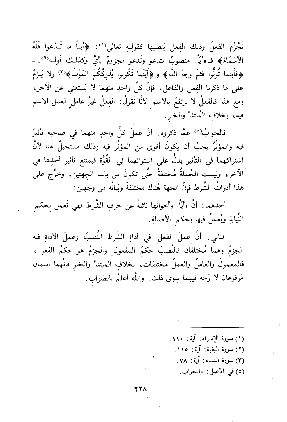 تَجْزُم الفعلَ وذلك الفِعل يَنصبها كقولِهِ تعالى: {أيّاً ما تَدْعوا فَلَهُ الأَسْمَاءُ} ف ((أيّاً)) منصوبٌ بتدعو وتَدعو مجزومٌ بأيٍّ وكذلك قَوله: {فأَينما تُولُّوا فثمَّ وَجْهُ اللَّه} و {أَيْنَما تَكُونوا يُدْرِكْكُمْ المَوْتُ} ولا يَلزمُ على ما ذكرنا الفِعل والفَاعل، فإنّ كلَّ واحدٍ منهما لا يَستغني عن الآخرِ، ومع هذا فالفعلُ لا يرتفعُ بالاسمِ لأنَّا نَقولُ: الفِعلُ غيرُ عاملٍ لعمل الاسم فيه، بخلافِ المُبتدأ والخبرِ.