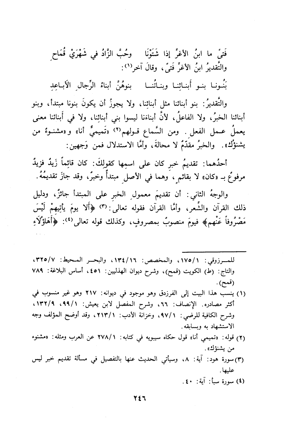 والتَّقديرُ: بنو أبنائنا مثل أبنائِنا، ولا يجوزُ أن يكونَ بنونا مبتدأ، وبنو أبنائنا الخبرُ، ولا الفاعلُ، لأنَّ أبناءَنا ليسوا بني أبنائِنا، ولا في أَبنائنا معنى يعملُ عمل الفعلِ. ومن السَّماع قولهم ((تَميميُّ أنا)) و ((مشنوءُ من يشنؤُك)). والخبرُ مقدّمٌ لا محالةَ، وأمَّا الاستدلال فمن وَجهين: