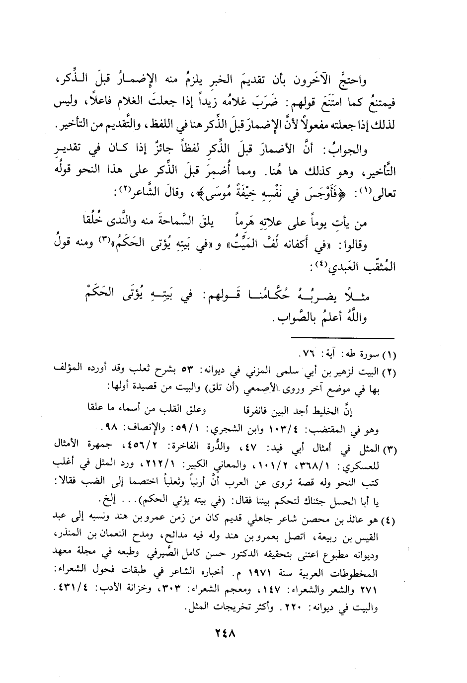 والجوابُ: أنَّ الأضمارَ قبلَ الذِّكرِ لفظاً جائزٌ إذا كان في تقديرِ التَّأخير، وهو كذلك ها هُنا. ومما أُضمِرَ قبلَ الذِّكر على هذا النحو قولُه تعالى: {فَأَوْجَسَ في نَفْسِهِ خِيْفَةً مُوسَى}، وقالَ الشَّاعر: