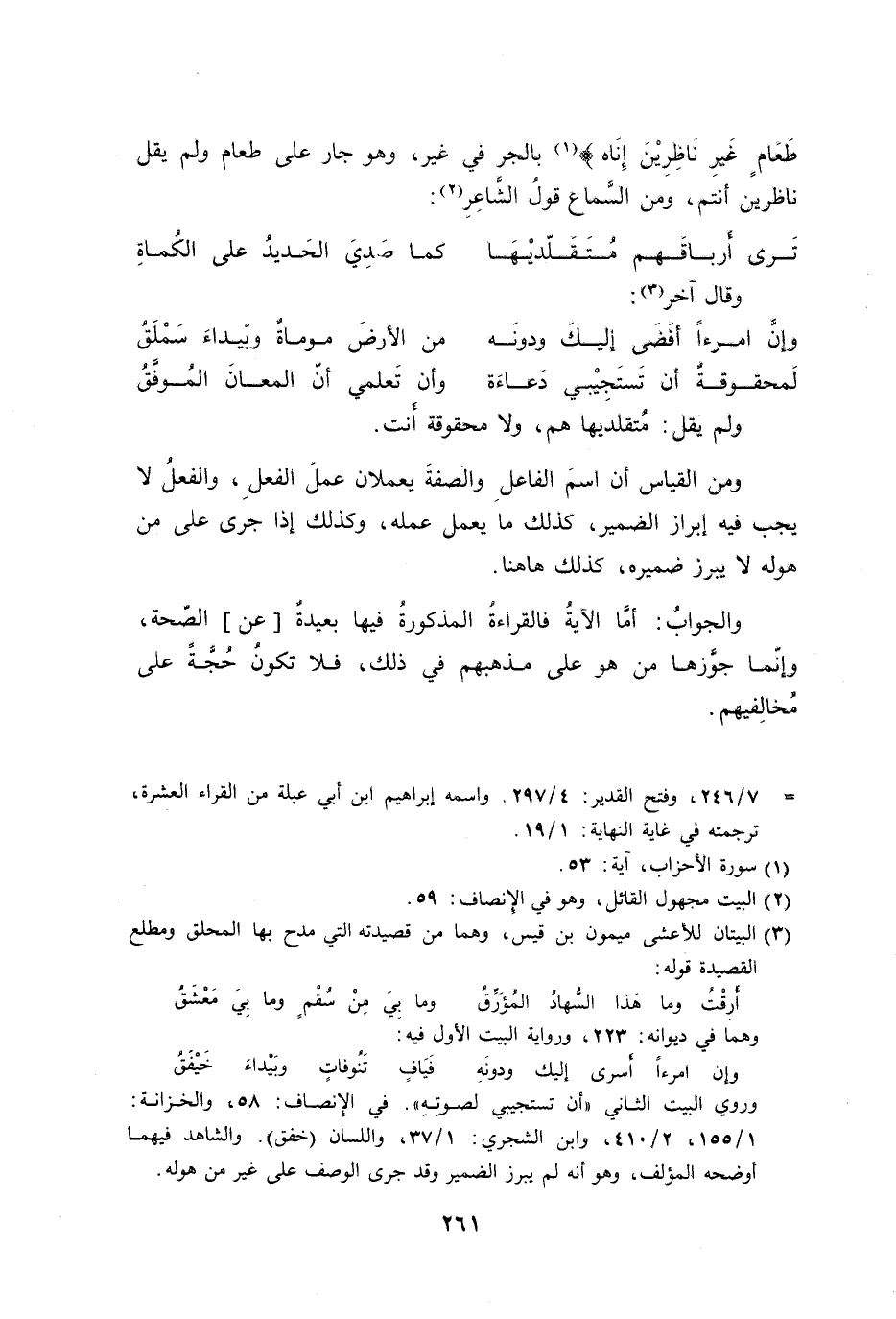 طَعَامٍ غَيرِ نَاظِرِيْنَ إِنَاه} بالجر في غير، وهو جار على طعام ولم يقل ناظرين أنتم، ومن السَّماع قولُ الشَّاعِرِ:
