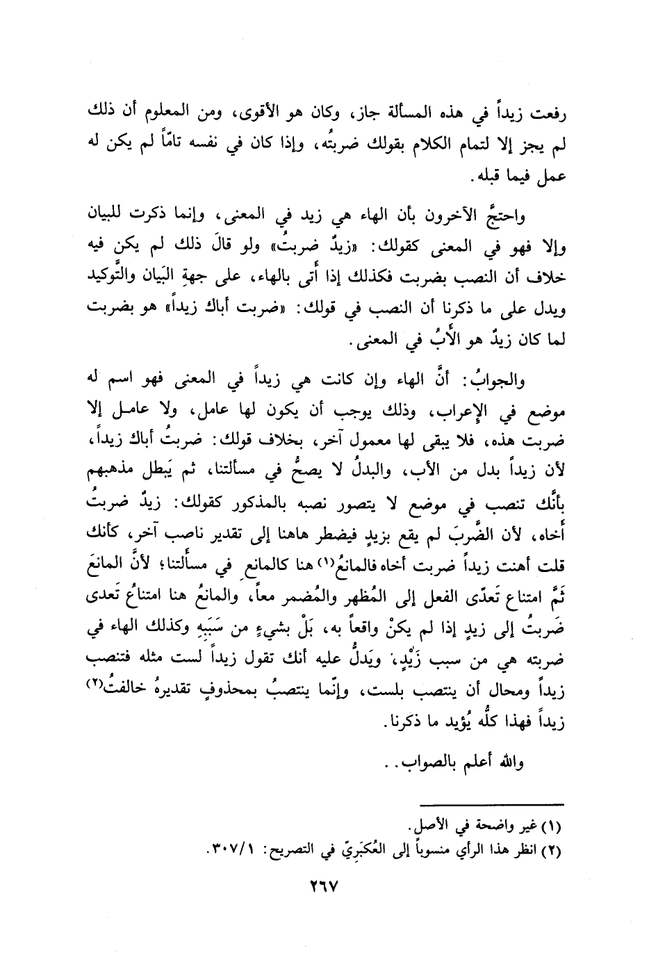 واحتجَّ الآخرون بأن الهاء هي زيد في المعنى، وإنما ذكرت للبيان وإلا فهو في المعنى كقولك: ((زيدٌ ضربتُ)) ولو قالَ ذلك لم يكن فيه خلاف أن النصب بضربت فكذلك إذا أَتى بالهاء، على جهةِ البَيان والتَّوكيد ويدل على ما ذكرنا أن النصب في قولك: ((ضربت أباك زيداً)) هو بضربت لما كان زيدٌ هو الأَبُ في المعنى.