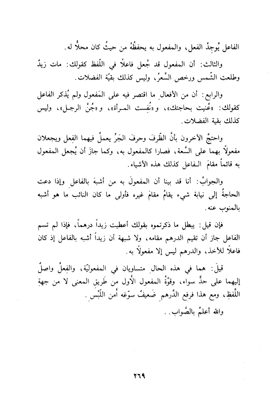 والثالث: أن المفعول قد جُعل فاعلاً في اللّفظ كقولك: مات زيدٌ وطلعت الشّمس ورخص السِّعرُ، وليس كذلك بقيّة الفضلات.