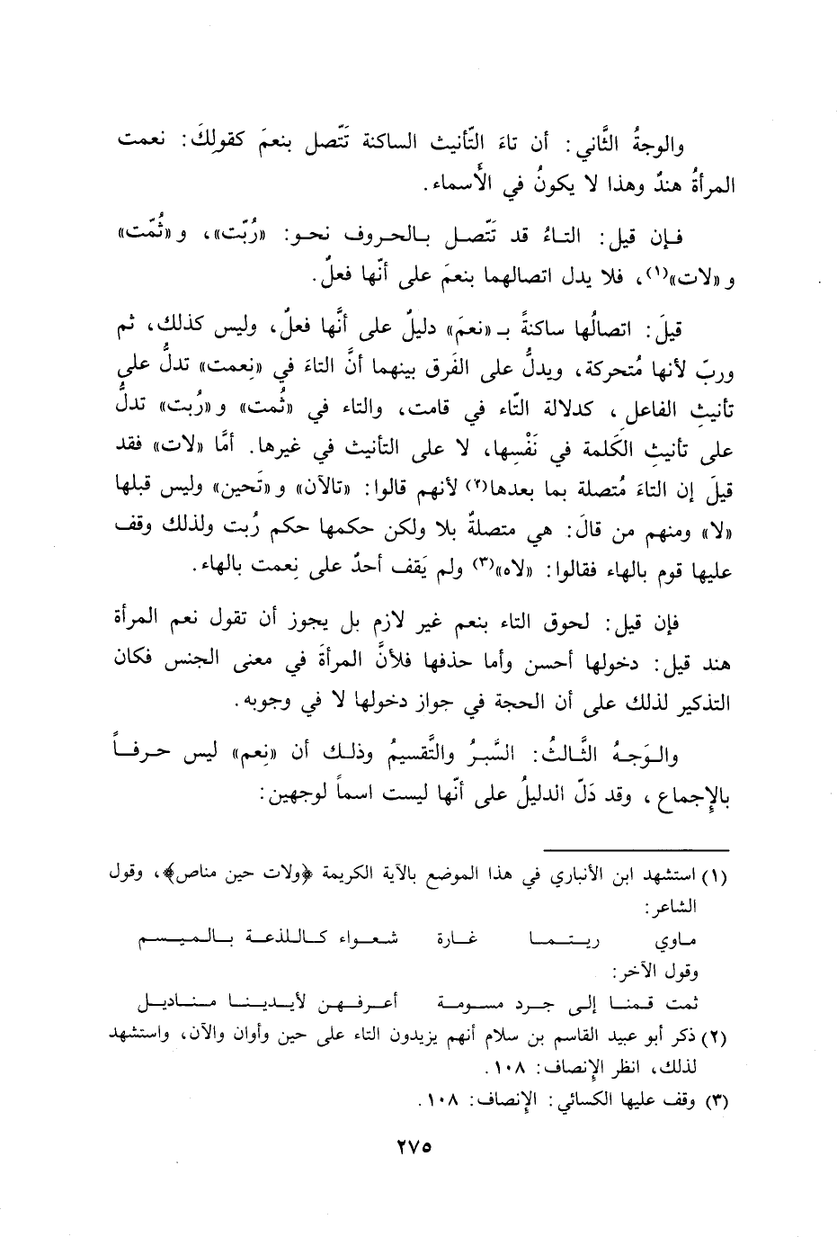 قيلَ: اتصالُها ساكنةً ب ((نعمَ)) دليلٌ على أنَّها فعلٌ، وليس كذلك، ثم وربّ لأنها مُتحركة، ويدلُّ على الفَرق بينهما أنَّ التاءَ في ((نِعمت)) تدلُّ على تأنيثِ الفاعلِ، كدلالة التّاء في قامت، والتاء في ((ثُمت)) و ((رُبت)) تدلُّ على تأنيثِ الكَلمة في نَفْسِها، لا على التأنيث في غيرها. أمَّا ((لات)) فقد قيلَ إن التاءَ مُتصلة بما بعدها لأنهم قالوا: ((تالآن)) و ((تَحين)) وليس قبلها ((لا)) ومنهم من قالَ: هي متصلةٌ بلا ولكن حكمها حكم رُبت ولذلك وقف عليها قوم بالهاء فقالوا: ((لاه)) ولم يَقف أحدٌ على نِعمت بالهاء.