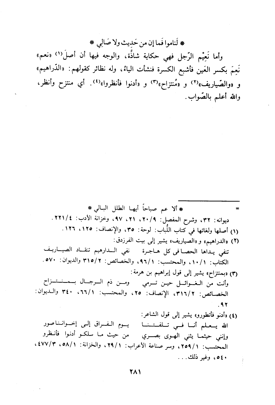 وأما نَعِيْم الرّجل فهي حكاية شاذَّة، والوجه فيها أن أصلَ ((نعم)) نَعِمَ بكسر العَين فأشبع الكسرة فنشأت الياءُ، وله نظائر كقولهم: ((الدّراهيم)) و ((والصّياريف)) و ((مُنتزاح)) و ((أدنوا فأنظروا)). أي منتزح وأنظر، والله أعلم بالصّواب.