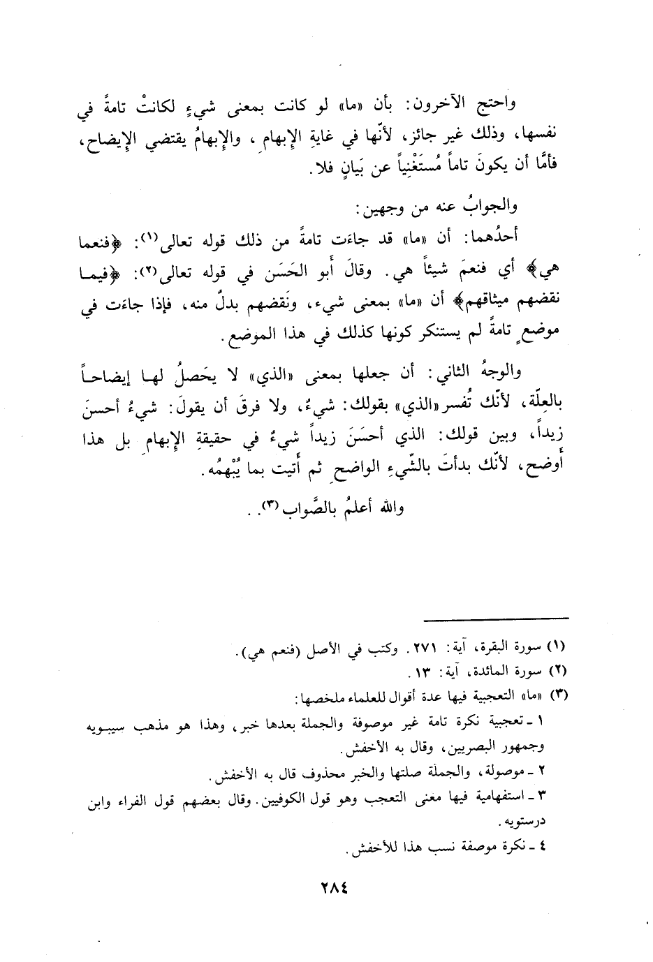 أحدُهما: أن ((ما)) قد جاءَت تامةً من ذلك قوله تعالى: {فنعما هي} أي فنعمَ شيئاً هي. وقالَ أَبو الحَسَن في قوله تعالى: {فيما نقضهم ميثاقهم} أن ((ما)) بمعنى شيء، ونَقضهم بدلٌ منه، فإذا جاءَت في موضعٍ تامةً لم يستنكر كونها في هذا الموضع.