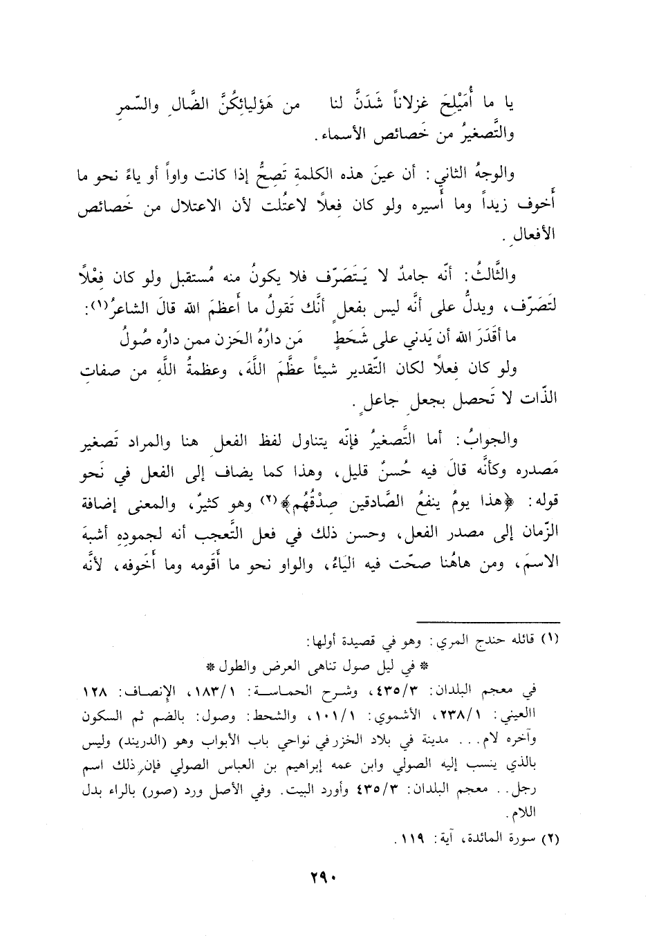 والجوابُ: أما التَّصغيرُ فإنّه يتناول لفظ الفعلِ هنا والمراد تَصغير مَصدره وكأنَّه قالَ فيه حُسنٌ قليل، وهذا كما يضاف إلى الفعل في نَحو قوله: {هذا يومُ ينفعُ الصَّادقين صِدْقُهُم} وهو كثيرٌ، والمعنى إضافة الزّمان إلى مصدر الفعل، وحسن ذلك في فعل التَّعجب أنه لجمودِهِ أشبهَ الاسمَ، ومن هاهُنا صحّت فيه الياءُ، والواو نحو ما أَقَومه وما أَخَوفه، لأنَّه