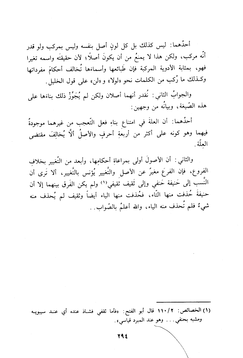والثاني: أن الأصولَ أولى بمراعاةِ أحكامِها، وأبعد من التّغيير بخلافِ الفروع، فإن الفرعَ مغيرٌ عن الأصلِ والتَّغيير يُؤنس بالتَّغيير، ألا تَرى أن النَّسب إلى حَنيفة وإلى ثَقيف ثَقيفي ولم يكن الفَرق بينهما إلا أن حنيفةَ حُذفت منها التّاء، فحُذفت منها الياء أيضاً وثقيف لم يُحذف منه شيءٌ فلم تُحذف منه الياء، والله أعلمُ بالصّواب ..