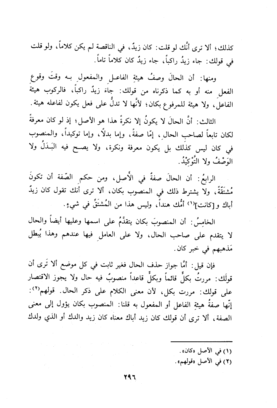 ومنها: أن الحالَ وصفُ هيئةِ الفاعلِ والمفعولِ به وقتَ وقوعِ الفعلِ منه أو به كما ذكرناه من قولك: جاءَ زيدٌ راكباً، فالركوب هيئةَ الفاعل، ولا هيئة للمرفوع بكان؛ لأنَّها لا تدلُّ على فعل يكون لفاعله هيئة.