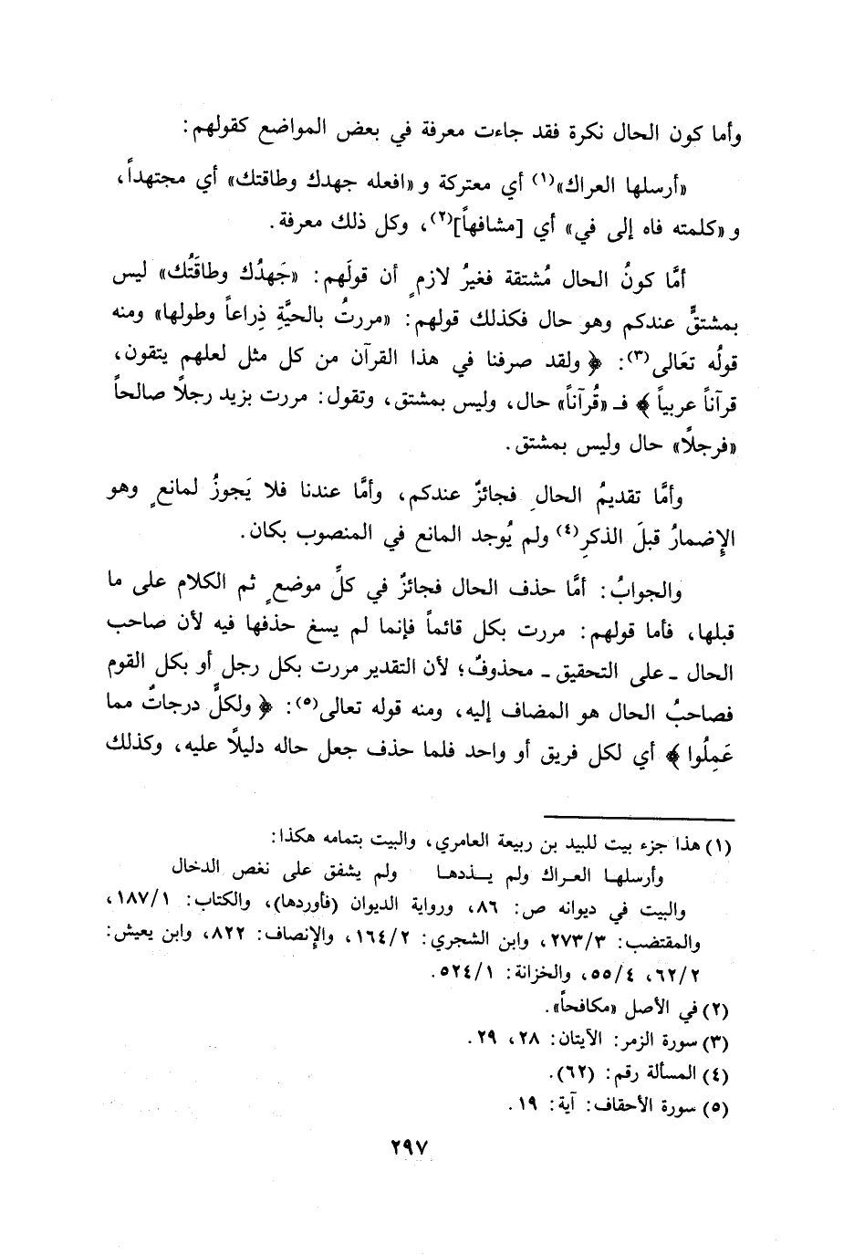 أمَّا كونُ الحال مُشتقة فغيرُ لازمٍ أن قولَهم: ((جَهدُك وطاقَتُك)) ليس بمشتقٍّ عندكم وهو الحال فكذلك قولهم: ((مررتُ بالحيَّةِ ذِراعاً وطولها)) ومنه قولُه تَعالى: {ولقد صرفنا في هذا القرآن من كل مثل لعلهم يتقون، قرآناً عربياً} ف ((قُرآناً)) حال، وليس بمشتق، وتقول: مررت بزيد رجلاً صالحاً ((فرجلاً)) حال وليس بمشتق.