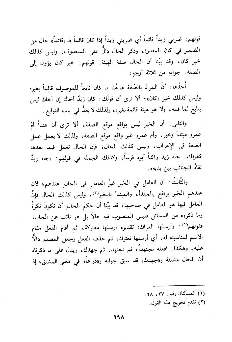 قولهم: ضربي زيداً قائماً أي ضربني زيداً إذا كان قائماً ف ((قائماً)) حال من الضمير في كان المقدرة، وذكر الحال دالٌّ على المحذوف، وليس كذلك خبر كان، وقد بيّنا أن الحال صفة الهيئة. قولهم: خبر كان يؤول إلى الصفة. جوابه من ثلاثة أوجهٍ: