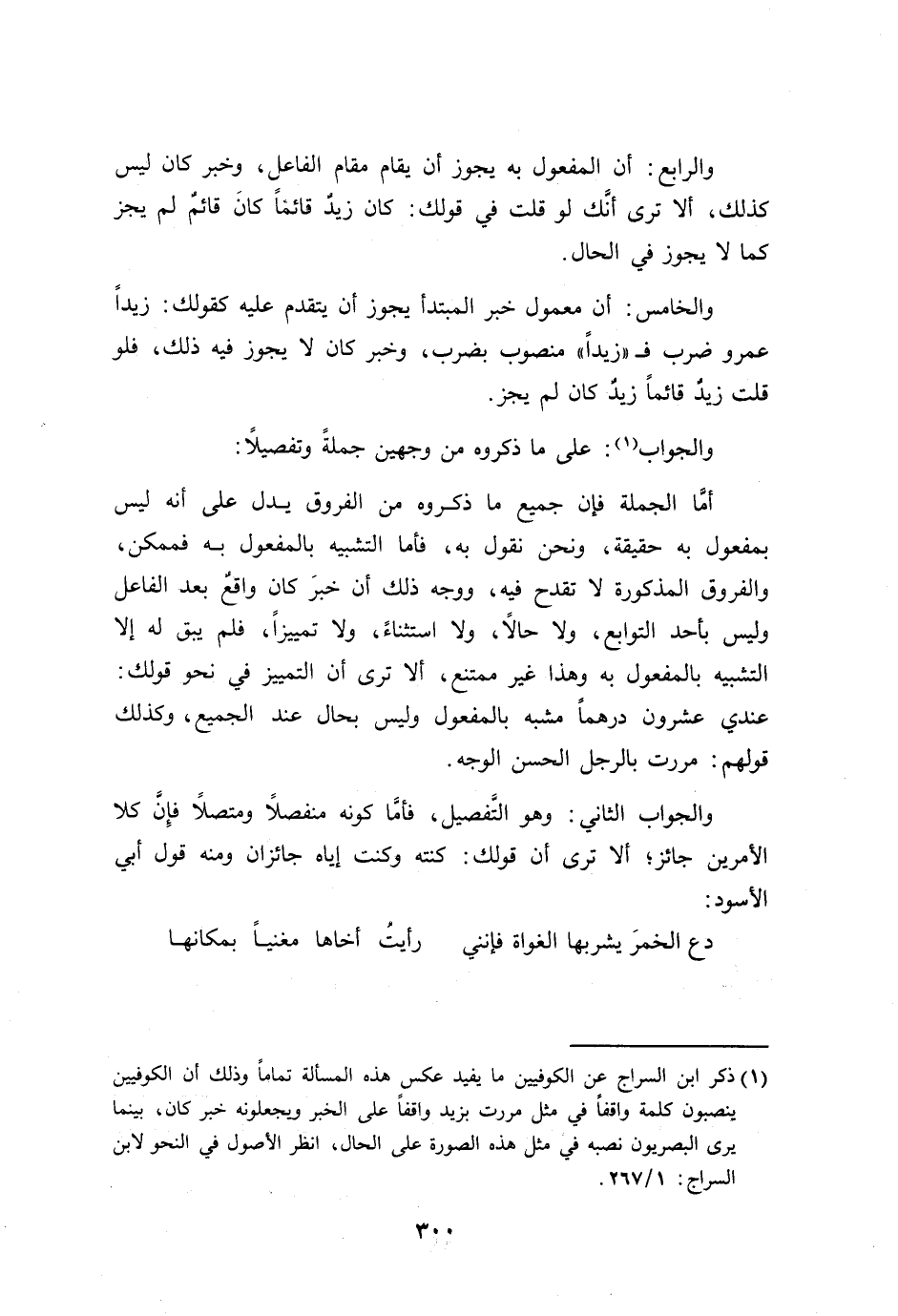 أمَّا الجملة فإن جميع ما ذكروه من الفروق يدل على أنه ليس بمفعول به حقيقة، ونحن نقول به، فأما التشبيه بالمفعول به فممكن، والفروق المذكورة لا تقدح فيه، ووجه ذلك أن خبرَ كان واقعٌ بعد الفاعل وليس بأحد التوابع، ولا حالاً، ولا استثناءً، ولا تمييزاً، فلم يبق له إلا التشبيه بالمفعول به وهذا غير ممتنع، ألا ترى أن التمييز في نحو قولك: