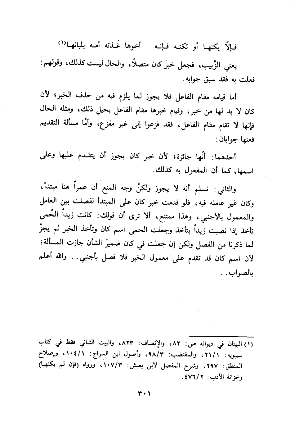 أما قيامه مقام الفاعل فلا يجوز لما يلزم فيه من حذف الخبر؛ لأن كان لا بد لها من خبر، وقيام خبرها مقام الفاعل يحيل ذلك، ومثله الحال فإنها لا تقام مقام الفاعل، فقد فزعوا إلى غير مفزع، وأمَّا مسألة التقديم فعنها جوابان: