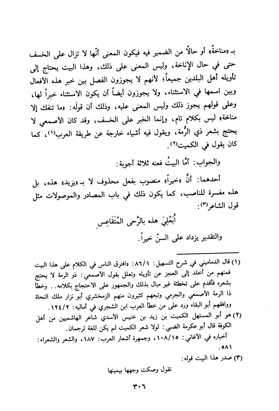 بـ ((مناخةً)) أو حالاً من الضمير فيه فيكون المعنى أنّها لا تزال على الخسف حتى في حال الإِناخة، وليس المعنى على ذلك، وهذا البيت يحتاج إلى تأويله أهل البلدين جميعاً؛ لأنهم لا يجوزون الفصل بين خبر هذه الأفعال وبين اسمها في الاستثناء، ولا يجوزون أيضاً أن يكون الاستثناء خبراً لها، وعلى قولهم يجوز ذلك وليس المعنى عليه، وذلك أن قولَه: (ما تنفك إلا مناخة)) ليس بكلام تام، وإنما الخبر على الخسف، وقد كان الأصمعي لا يحتج بشعر ذي الرُّمة، ويقول فيه أشياء خارجة عن طريقة العرب، كما كان يقول في الكميت.