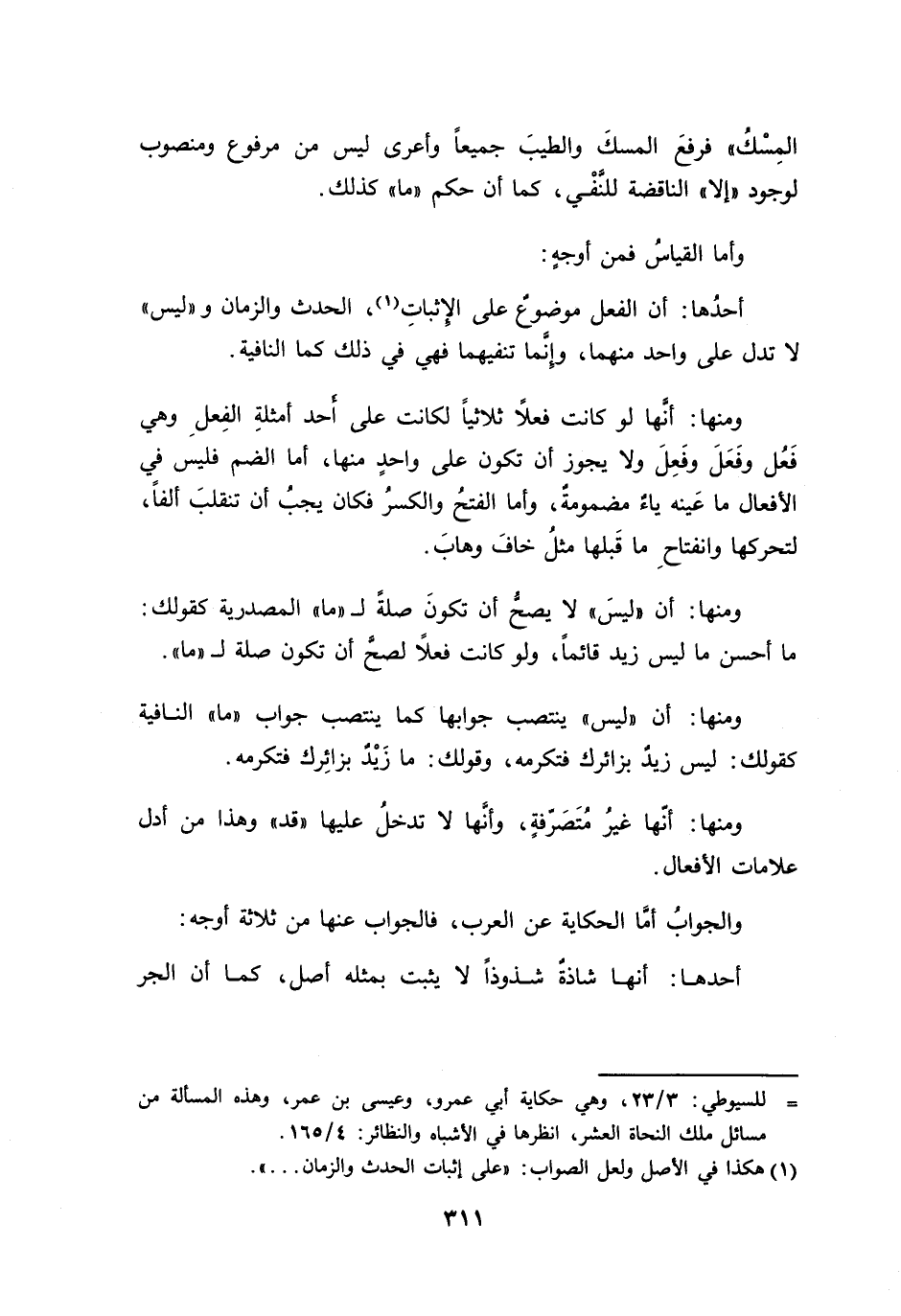 أحدُها: أن الفعل موضوعٌ على الإِثباتِ، الحدث والزمان و ((ليس)) لا تدل على واحد منهما، وإِنَّما تنفيهما فهي في ذلك كما النافية.