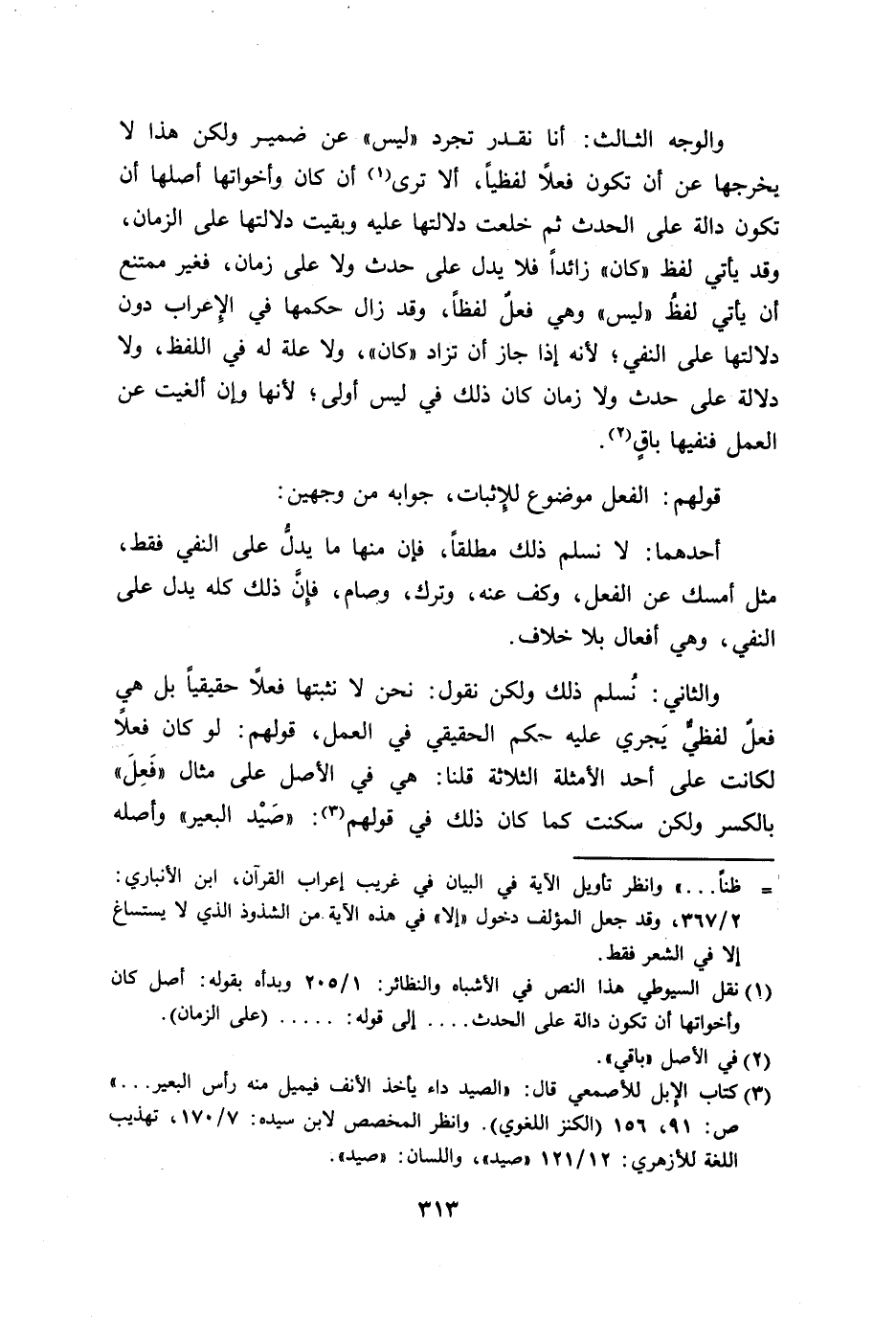 والوجه الثالث: أنا نقدر تجرد ((ليس)) عن ضمير ولكن هذا لا يخرجها عن أن تكون فعلاً لفظياً، ألا ترى أن كان وأخواتها أصلها أن تكون دالة على الحدث ثم خلعت دلالتها عليه وبقيت دلالتها على الزمان، وقد يأتي لفظ ((كان)) زائداً فلا يدل حدث ولا على زمان، فغير ممتنع أن يأتي لفظٌ ((ليس)) وهي فعلٌ لفظاً، وقد زال حكمها في الإِعراب دون دلالتها على النفي؛ لأنه إذا جاز أن تزاد ((كان))، ولا علة له في اللفظ، ولا دلالة على حدث ولا زمان كان ذلك في ليس أولى؛ لأنها وإن ألغيت عن العمل فنفيها باقٍ.