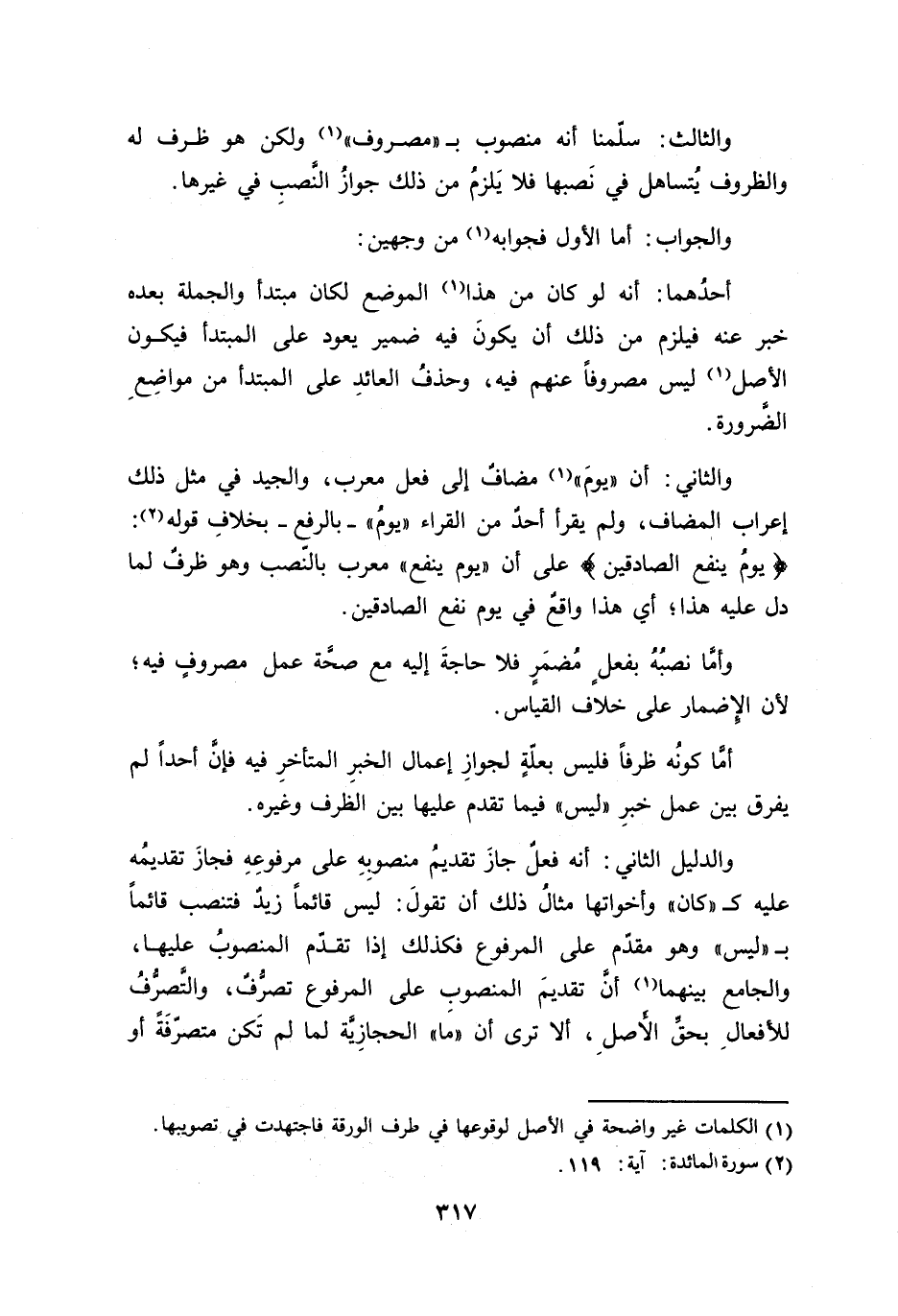 والثالث: سلّمنا أنه منصوب ب ((مصروف)) ولكن هو ظرف له والظروف يُتساهل في نَصبها فلا يَلزمُ من ذلك جوازُ النَّصبِ في غيرها.
