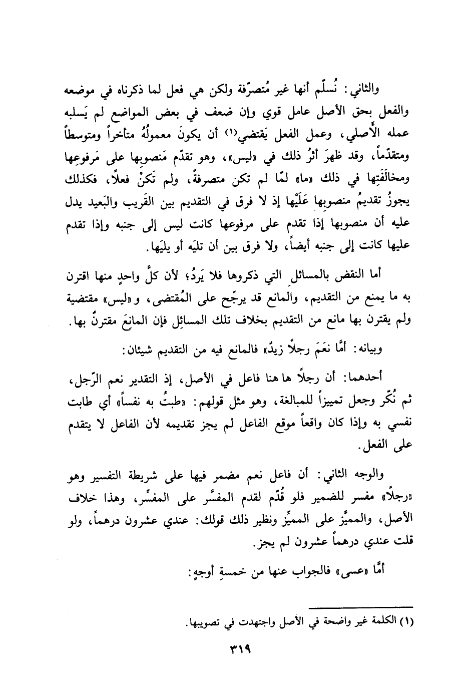 والثاني: نُسلّم أنها غير مُتصرّفة ولكن هي فعل لما ذكرناه في موضعه والفعل بحق الأصل عامل قوي وإن ضعف في بعض المواضع لم يَسلبه عمله الأَصلي، وعمل الفعل يَقتضي أن يكونَ معمولُهُ متأخراً ومتوسطاً ومتقدّماً، وقد ظهرَ أثرُ ذلك في ((ليس))، وهو تقدّم مَنصوبِها على مَرفوعِها ومخالَفَتِها في ذلك ((ما)) لمّا لم تكن متصرفةً، ولم تَكنْ فعلاً، فكذلك يجوزُ تقديمُ منصوبِها عَلَيْها إذ لا فرق في التقديم بين القَريب والبَعيد يدل عليه أن منصوبها إذا تقدم على مرفوعها كانت ليس إلى جنبه وإذا تقدم عليها كانت إلى جنبه أيضًا، ولا فرق بين أن تليَه أو يليَها.