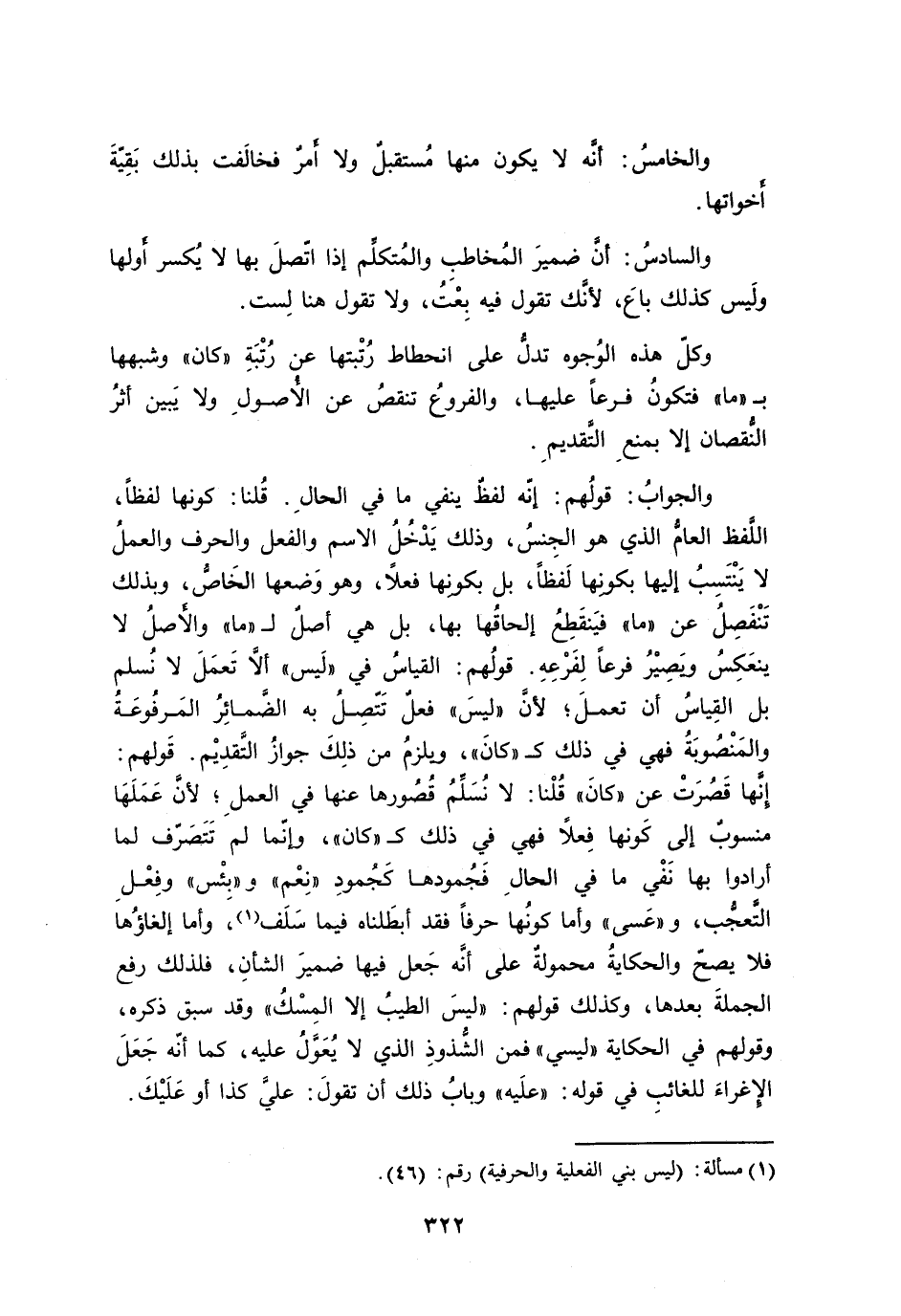 والجوابُ: قولُهم: إنّه لفظٌ ينفي ما في الحالِ. قُلنا: كونها لفظاً، اللّفظ العامُّ الذي هو الجِنْسُ، وذلك يَدْخُلُ الاسم والفعل والحرف والعملُ لا يَنْتَسْبُ إليها بكونِها لَفظاً، بل بكونِها فعلاً، وهو وَضعها الخَاصُّ، وبذلك تَنْفَصِلُ عن ((ما)) فَيَنقَطِعُ إلحاقُها بها، بل هي أصلٌ ل ((ما)) والأَصلُ لا ينعَكِسُ ويَصِيْرُ فرعاً لِفَرْعِهِ. قولُهم: القياسُ في ((لَيس)) ألاَّ تَعمَلَ لا نُسلم بل القِياسُ أن تعملَ؛ لأنَّ ((ليسَ)) فعلٌ تَتّصِلُ به الضَّمائِرُ المَرفُوعَةُ والمَنْصُوبَةُ فهي في ذلك ك ((كانَ))، ويلزمُ من ذلِكَ جوازُ التَّقدِيْم. قَولهم: إِنَّها قُصُرَتْ عن ((كانَ)) قُلْنا: لا نُسَلِّمُ قُصُورها عنها في العملِ؛ لأنَّ عَمَلَهَا منسوبٌ إلى كَونها فِعلاً فهي في ذلك ك ((كان))، وإنّما لم تَتَصَرّف لما أرادوا بها نَفْي ما في الحالِ فَجُمودها كَجُمودِ ((نِعْم)) و ((بِئْس)) وفِعْلِ التَّعجُّب، و ((عَسى)) وأما كونُها حرفًا فقد أبطَلناه فيما سَلَف، وأما إلغاؤُها فلا يصحّ والحكايةُ محمولةٌ على أنَّه جَعل فيها ضميرَ الشأنِ، فلذلك رفع الجملةَ بعدها، وكذلك قولهم: ((ليسَ الطيبُ إلا المِسْكُ)) وقد سبق ذكره، وقولهم في الحكاية ((ليسي)) فمن الشُّذوذِ الذي لا يُعَوَّلُ عليه، كما أنّه جَعَلَ الإِغراءَ للغائبِ في قوله: ((علَيه)) وبابُ ذلك أن تقولَ: عليَّ كذا أو عَلَيْكَ.