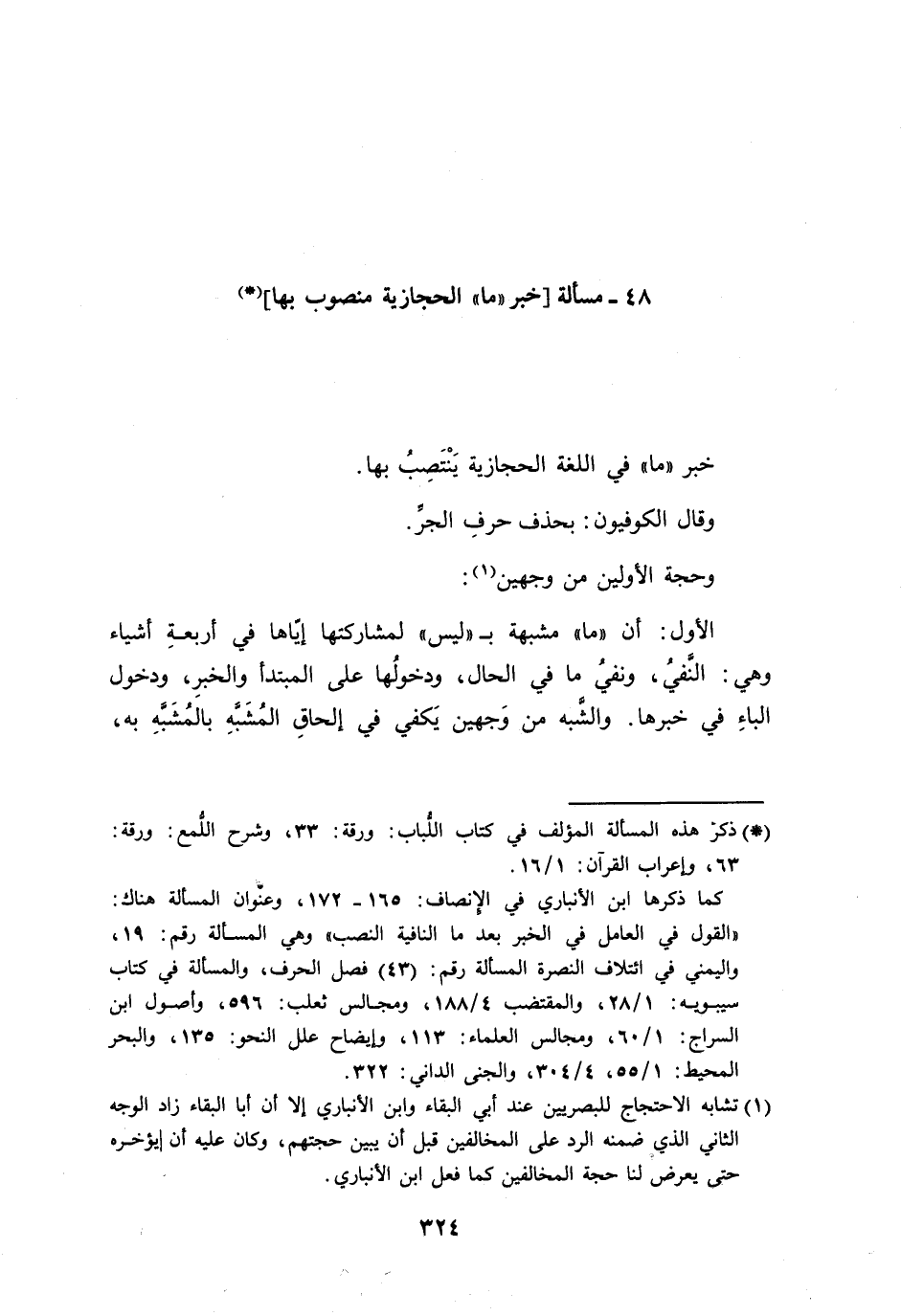 الأول: أن ((ما)) مشبهة ب ((ليس)) لمشاركتها إيَّاها في أربعةِ أشياء وهي: النَّفيُ، ونفيُ ما في الحال، ودخولُها على المبتدأ والخبرِ، ودخول الباءِ في خبرها. والشَّبه من وَجهين يَكفي في إلحاقِ المُشَبَّهِ بالمُشَبَّهِ به،