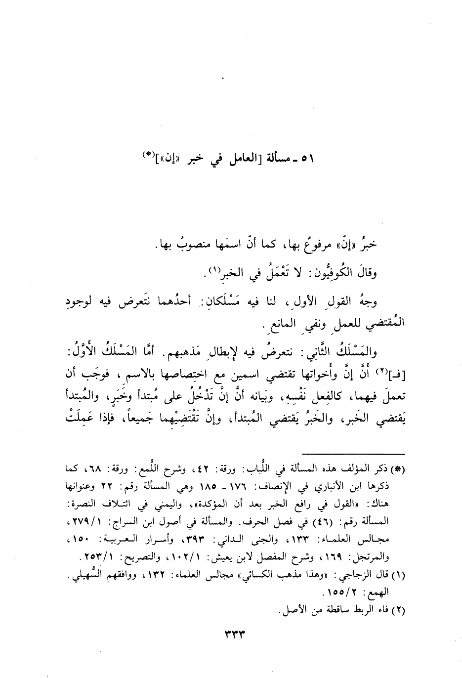 والمَسْلَكُ الثَّانِي: نتعرضُ فيه لإِبطالِ مَذهبهم. أمَّا المَسْلَكُ الأَوَّلُ: [فـ] أنَّ إنَّ وأَخواتها تقتضي اسمين مع اختِصاصها بالاسمِ، فوجَب أن تعملَ فيهما، كالفِعل نَفْسِهِ، وبَيانه أنَّ إنَّ تَدْخُلُ على مُبتدأ وخَبَرٍ، والمُبتدأ يَقتضي الخَبر، والخَبرُ يَقتضي المُبتدأ، وإنَّ تَقْتَضِيْهِما جَميعاً، فإذا عَمِلَتْ