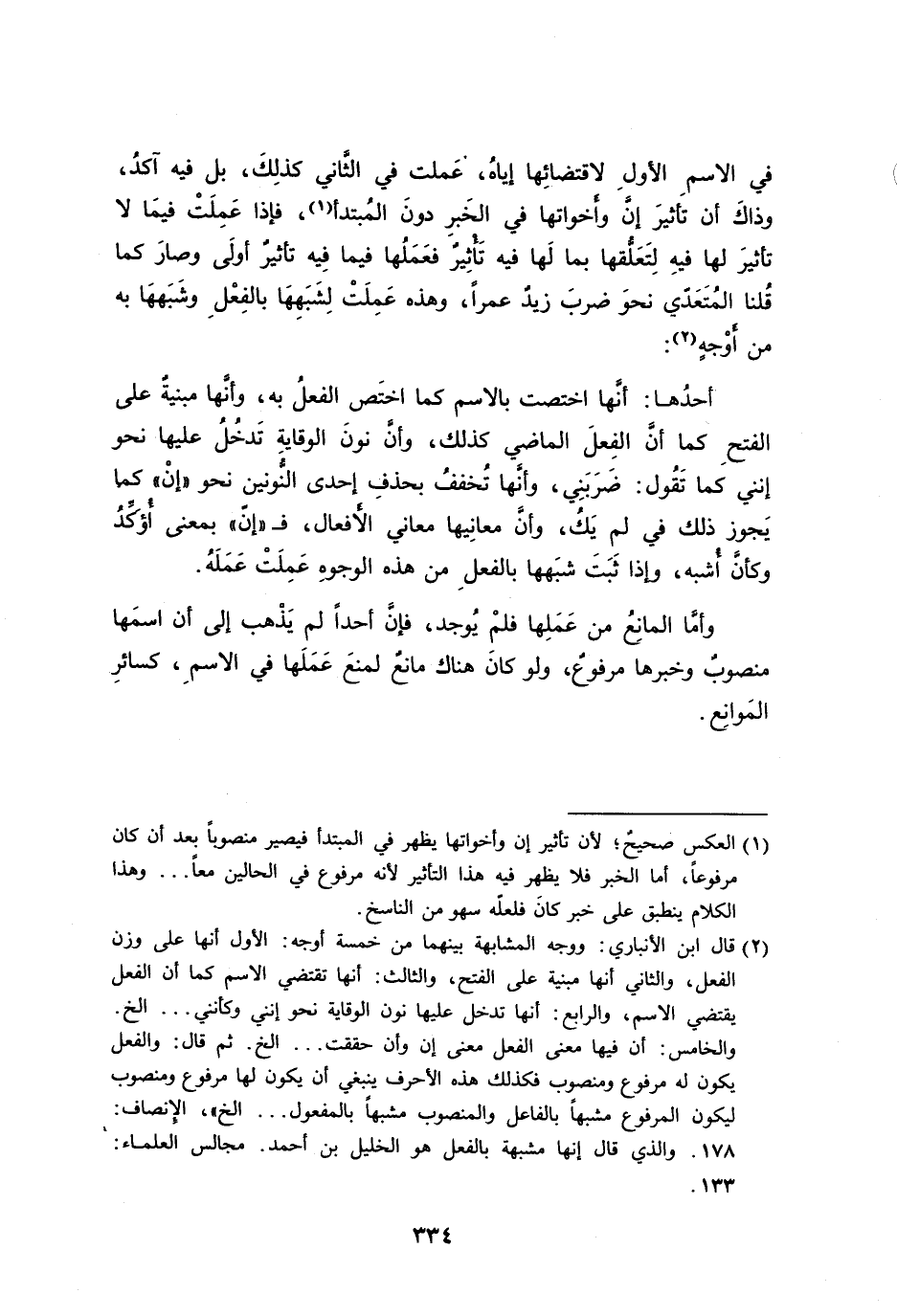 أحدُهما: أنَّها اختصت بالاسم كما اختَص الفعلُ به، وأنَّها مبنيةٌ على الفتحِ كما أنَّ الفِعلَ الماضي كذلك، وأنَّ نونَ الوقايةِ تَدخُلُ عليها نحو إنني كما تَقُول: ضَرَبَنِي، وأنَّها تُخففُ بحذفِ إحدى النُّونين نحو ((إنْ)) كما يَجوز ذلك في لم يَكُ، وأنَّ معانِيها معاني الأَفعال، فـ ((إنّ)) بمعنى أُؤكِّدُ وكأنَّ أُشبه، وإذا ثَبَتَ شبَهها بالفعلِ من هذه الوجوهِ عَمِلَتْ عَمَلَهُ.