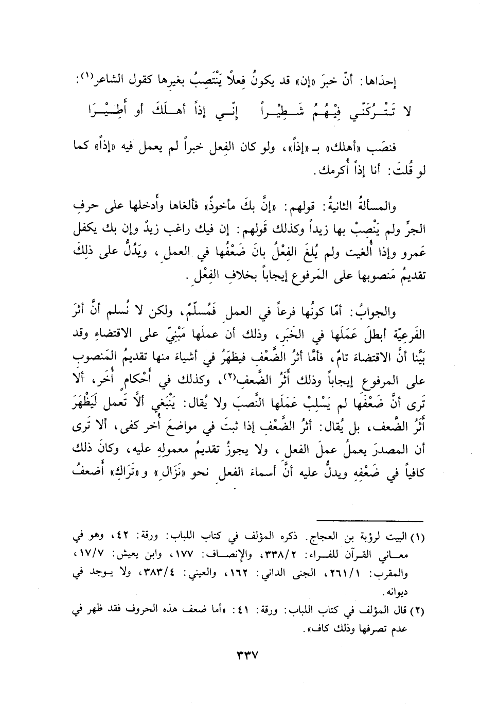 والجوابُ: أمّا كونُها فرعاً في العملِ فَمُسلّمٌ، ولكن لا نُسلم أنَّ أثرَ الفَرعِيّة أبطلَ عَمَلَها في الخَبَرِ، وذلك أن عملَها مَبْنِيّ على الاقتضاءِ وقد بَيَّنا أنَّ الاقتضاءَ تامٌ، فأمَّا الضَّعْفِ فيظهَرُ في أشياءَ منها تقديمُ المَنصوبِ على المرفوعِ إيجاباً وذلك أَثَرُ الضَّعفِ، وكذلك في أَحْكامٍ أُخَر، ألا تَرى أنَّ ضَعْفَها لم يَسْلِبْ عَمَلَها النَّصبَ ولا يُقال: يَنْبَغي ألاَّ تَعمل لَيَظْهَرَ أَثَرُ الضَّعف، بل يُقال: أثرُ الضَّعْفِ إذا ثبتَ في مواضعَ أُخر كفى، ألا تَرى أن المصدرَ يعملُ عملَ الفعلِ، ولا يجوزُ تقديمُ معمولِهِ عليه، وكانَ ذلك كافياً في ضَعْفِهِ ويدلُّ عليه أنَّ أسماءِ الفعلِ نحو ((نَزَالِ)) و ((تَرَاكِ)) أَضعفُ