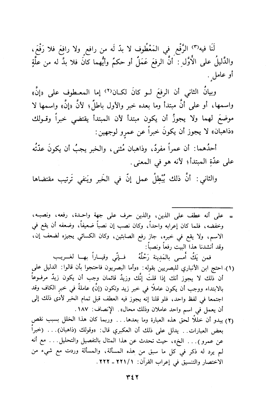 وبيانُ الثاني أن الرفعَ لو كانَ لكان إما المعطوف على ((إنَّ)) واسمها، أو على أنَّ مبتدأ وما بعده خبر والأول باطلٌ؛ لأنَّ ((إنَّ)) واسمها لا موضعَ لهما ولا يجوزُ أن يكون مبتدأ لأن المبتدأ يقتضي خبراً وقولك ((ذاهبان)) لا يجوز أن يكونَ خبراً عن عمرٍو لوجهين:
