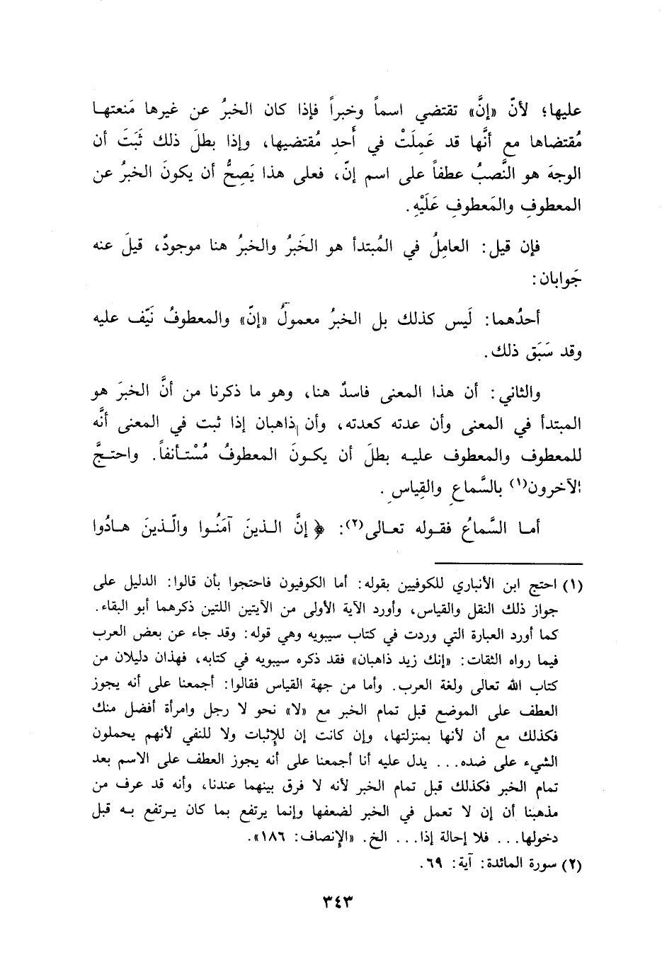 عليها؛ لأنّ ((إنَّ)) تقتضي اسماً وخبراً فإذا كان الخبرُ عن غيرها مَنعتها مُقتضاها مع أنَّها قد عَمِلَتْ في أَحدِ مُقتضيها، وإذا بطلَ ذلك ثَبَتَ أن الوجهَ هو النَّصبُ عطفاً على اسم إنّ، فعلى هذا يَصِحُّ أن يكونَ الخبرُ عن المعطوفِ والمَعطوفِ عَلَيْهِ.