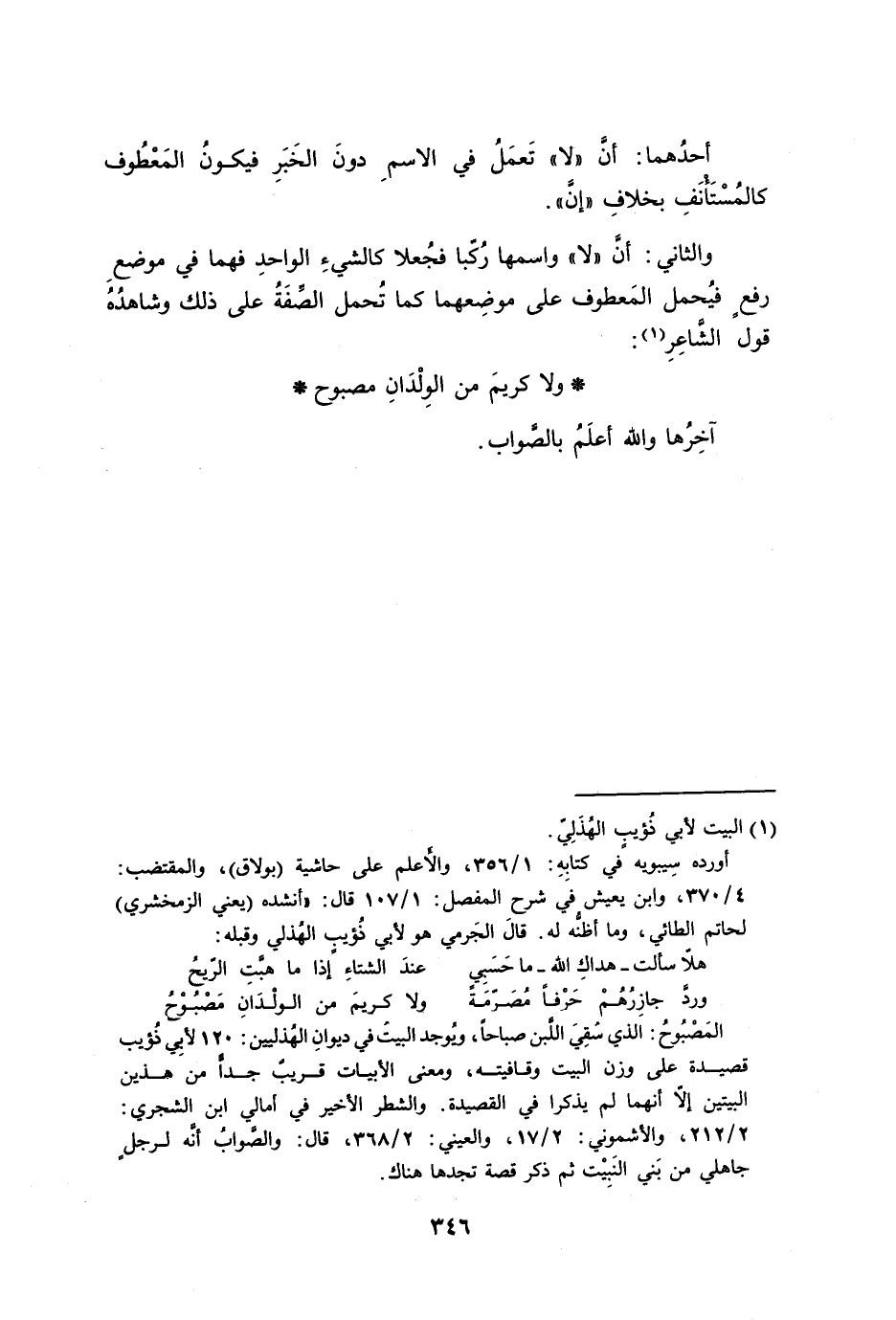 والثاني: أنَّ ((لا)) واسمها رُكّبا فجُعلا كالشيءِ الواحدِ فهما في موضعِ رفعٍ فيُحمل المَعطوف على موضِعهما كما تُحمل الصِّفَةُ على ذلك وشاهدُهُ قول الشَّاعِرِ: