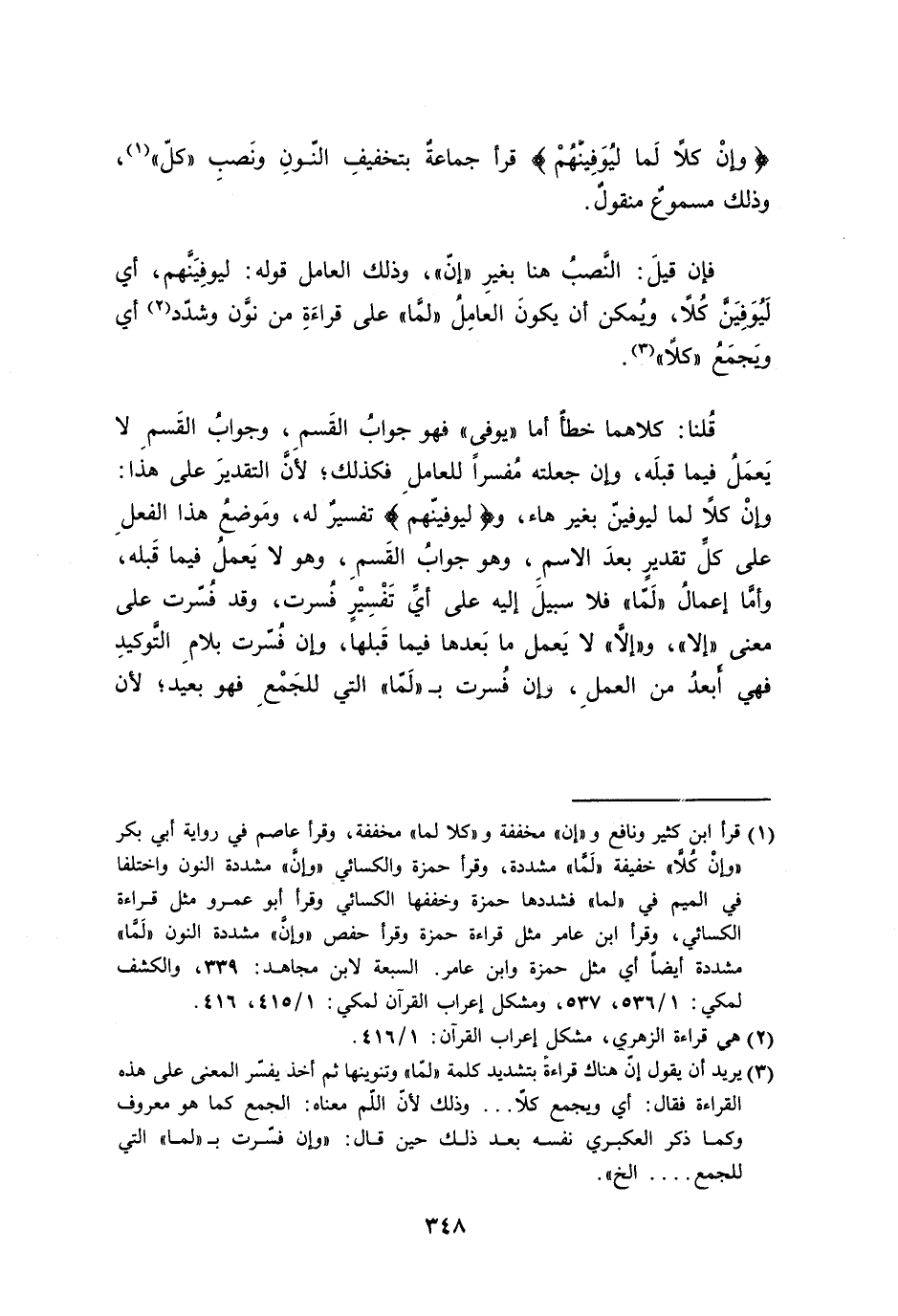 قُلنا: كلاهما خطأٌ أما ((يوفي)) فهو جوابُ القَسمِ، وجوابُ القَسمِ لا يَعمَلُ فيما قبلَه، وإن جعلته مُفسراً للعاملِ؛ لأنَّ التقديرَ على هذا: وإنْ كلاً لما ليوفينَّ بغير هاء، و {ليوفينّهم} تفسيرّ له، ومَوضعُ هذا الفعلِ على كلِّ تقديرٍ بعدَ الاسمِ، وهو جوابُ القَسمِ، وهو لا يَعملُ فيما قَبله، وأمَّا إعمالُ ((لَمّا)) فلا سبيلَ إليه على أيِّ تَفْسِيْرٍ فُسرت، وقد فُسّرت على معنى ((إلا))، و ((إلاَّ)) لا يَعمل ما بَعدها فيما قَبلها، وإن فُسّرت بلامِ التَّوكيدِ فهي أَبعدُ من العملِ، وإن فُسرت بـ ((لَمّا)) التي للجَمْعِ فهو بعيد؛ لأن